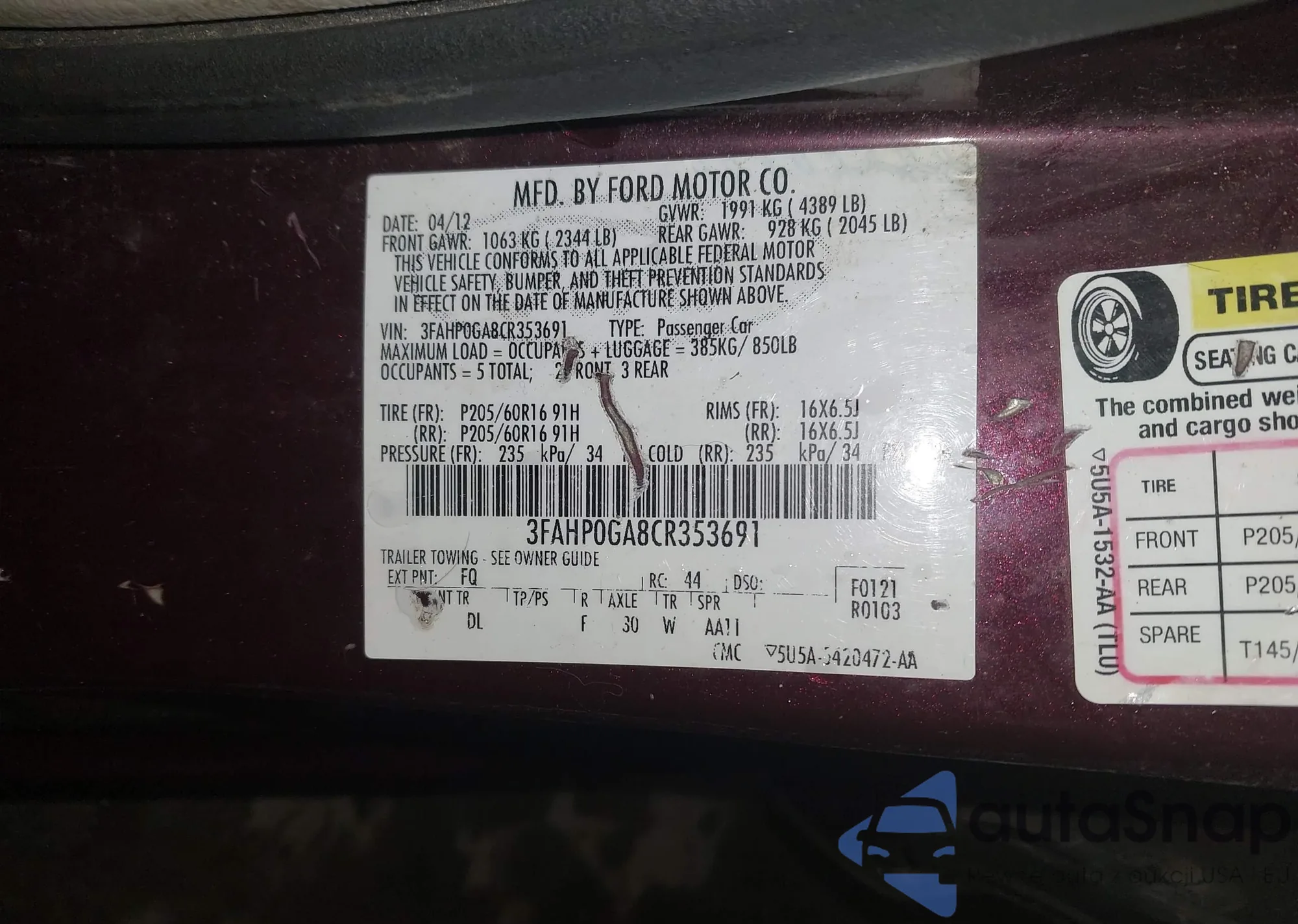 LOT: 44149967 VIN: 3FAHP0GA8CR353691
