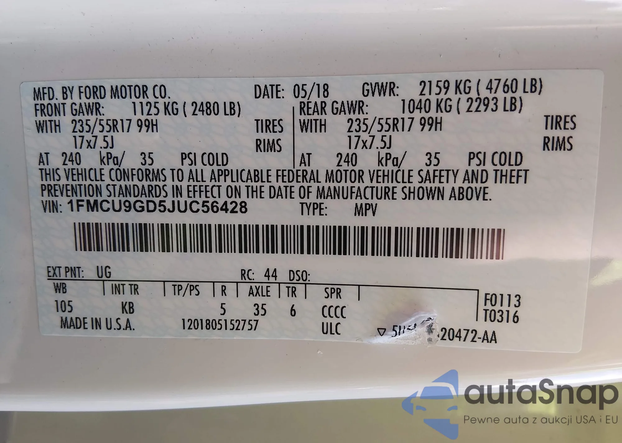 • VIN 1FMCU0GX1FUA78336
