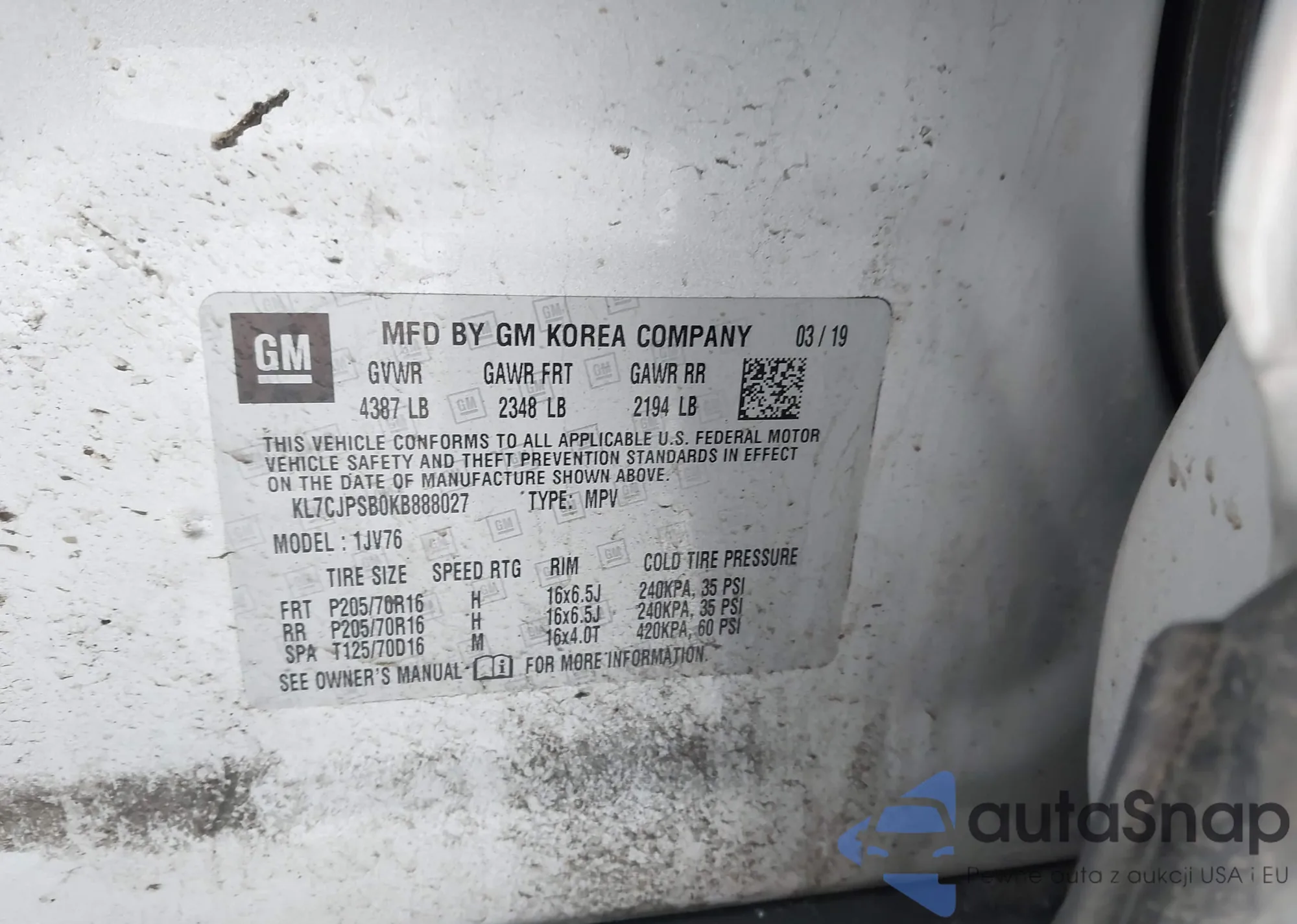 LOT: 44477926 VIN: KL7CJPSB0KB888027