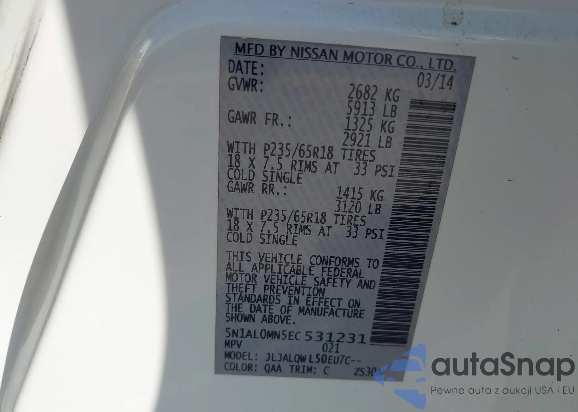 • VIN 5N1AL0MN5EC531231