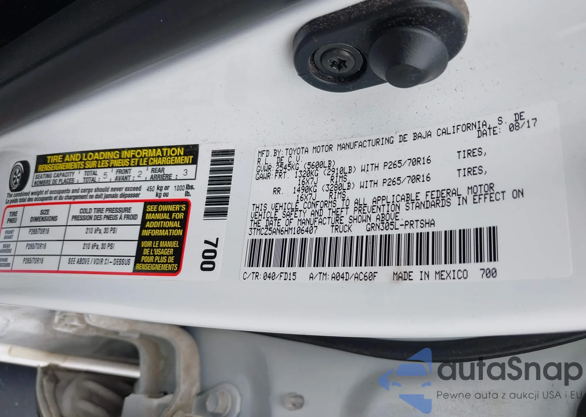 • VIN 3TMCZ5AN6HM106407