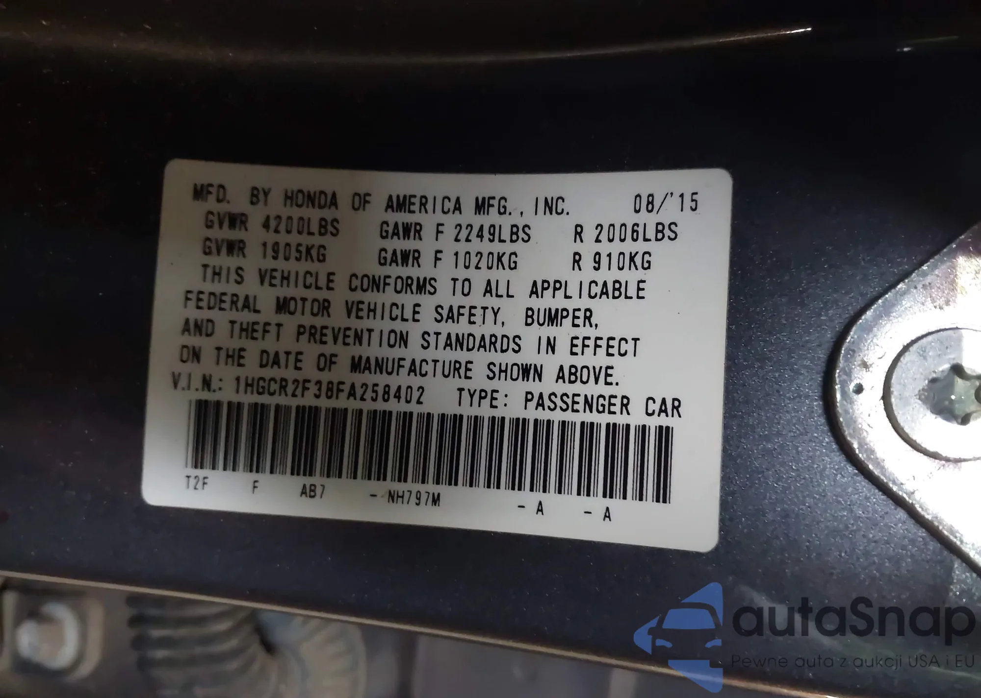 LOT: 42297331 VIN: 1HGCR2F38FA258402