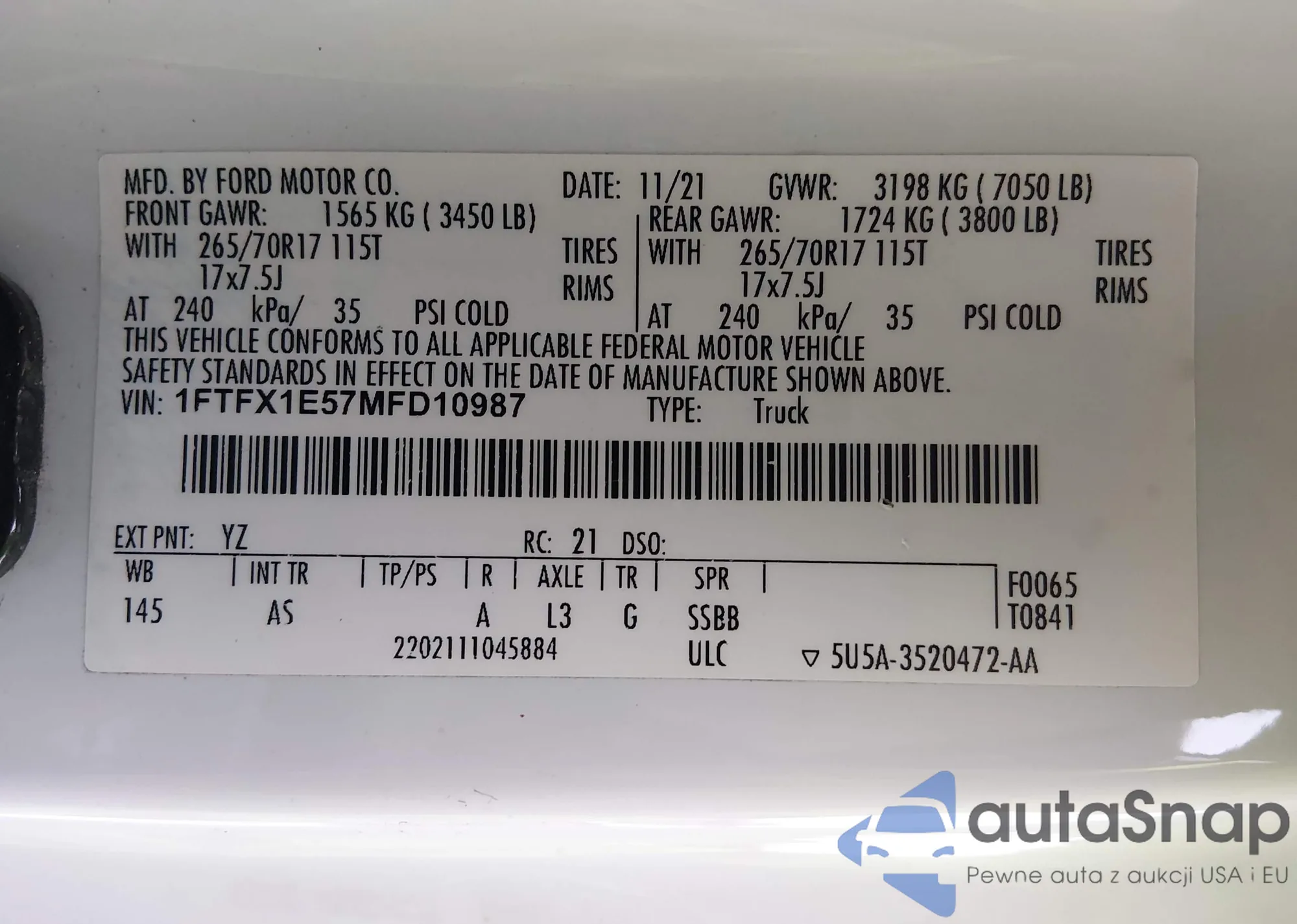 LOT: 44257342 VIN: 1FTFX1E57MFD10987