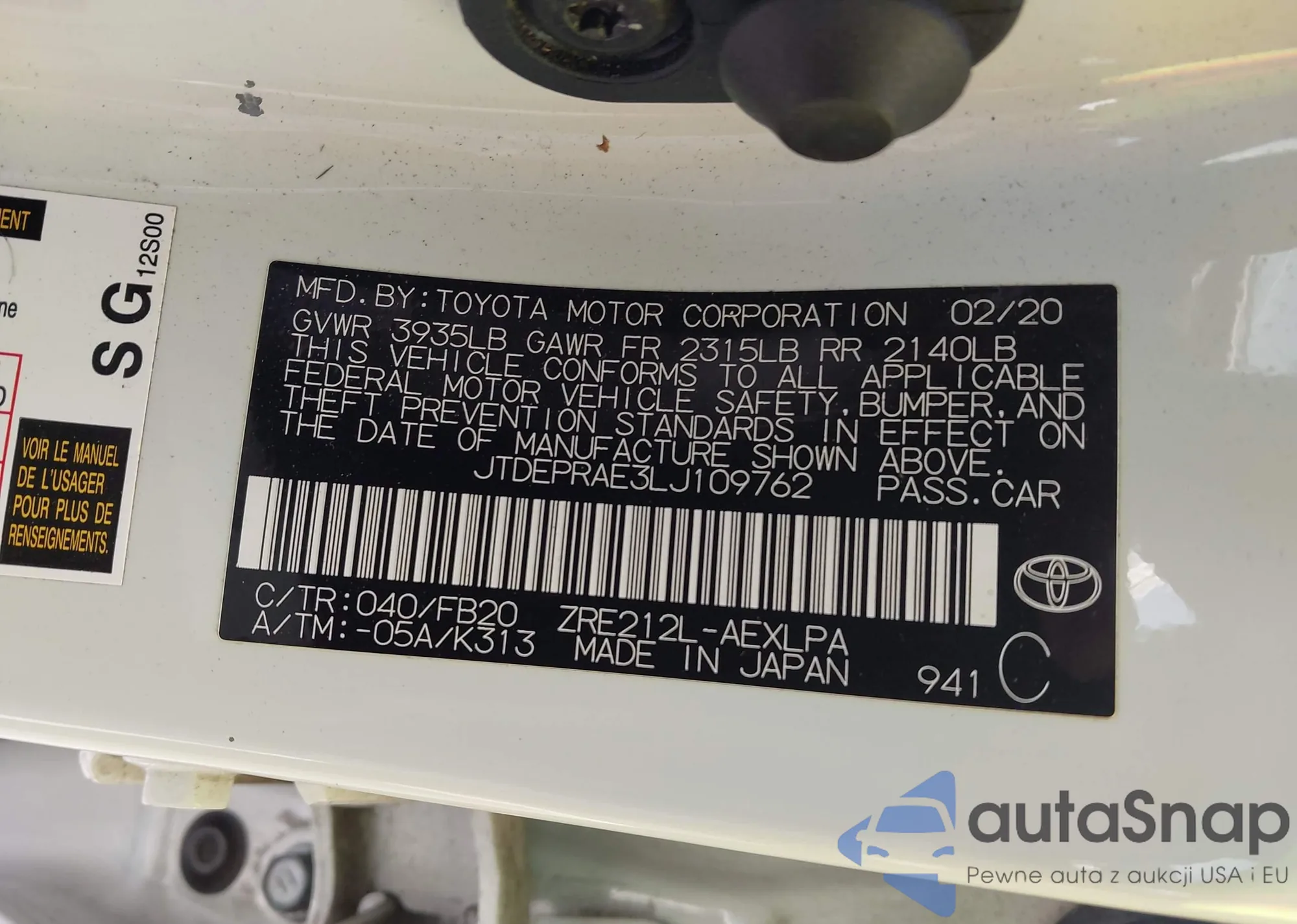 LOT: 44383971 VIN: JTDEPRAE3LJ109762