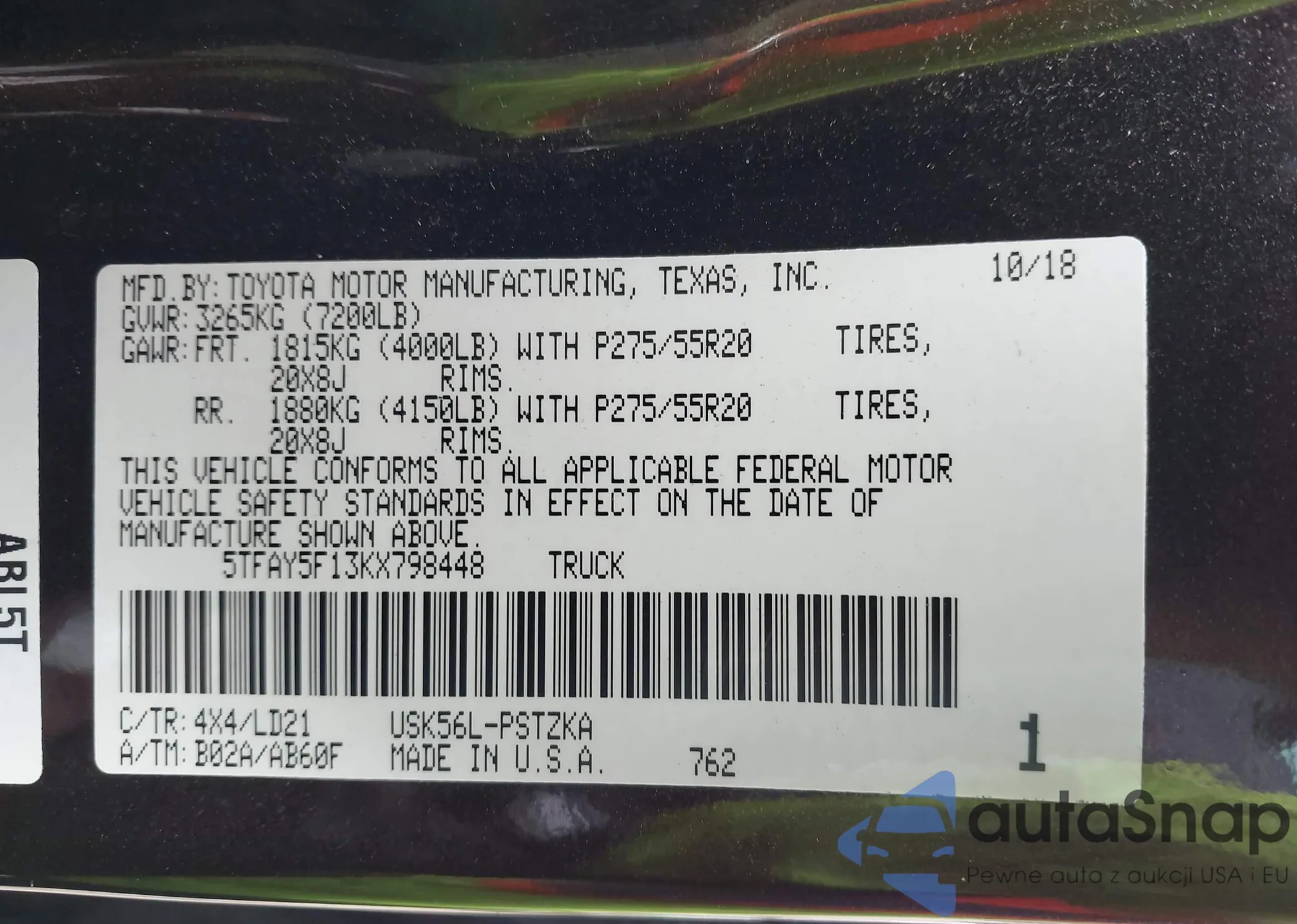 LOT: 44234375 VIN: 5TFAY5F13KX798448