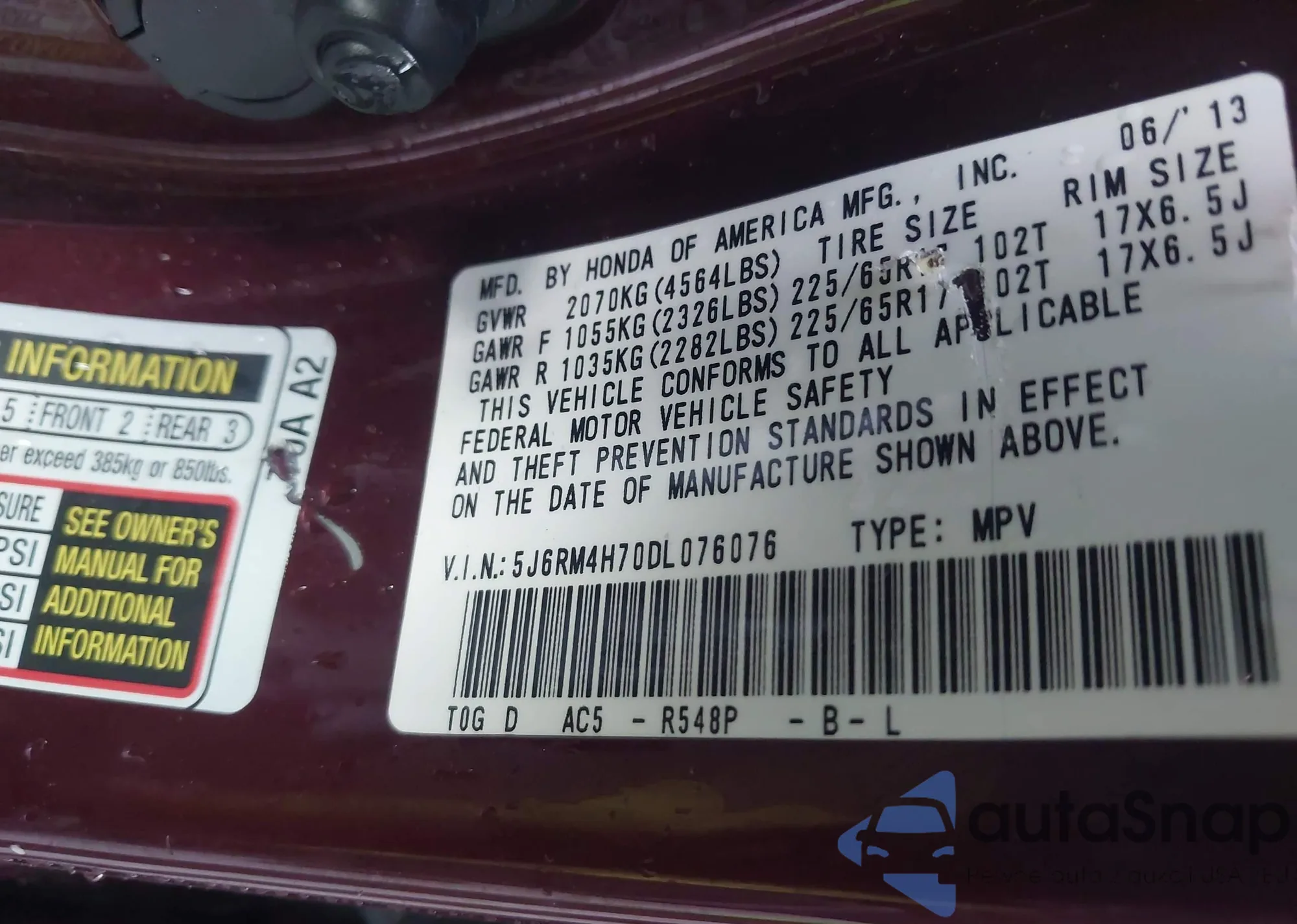 • VIN 5J6RM4H70DL076076