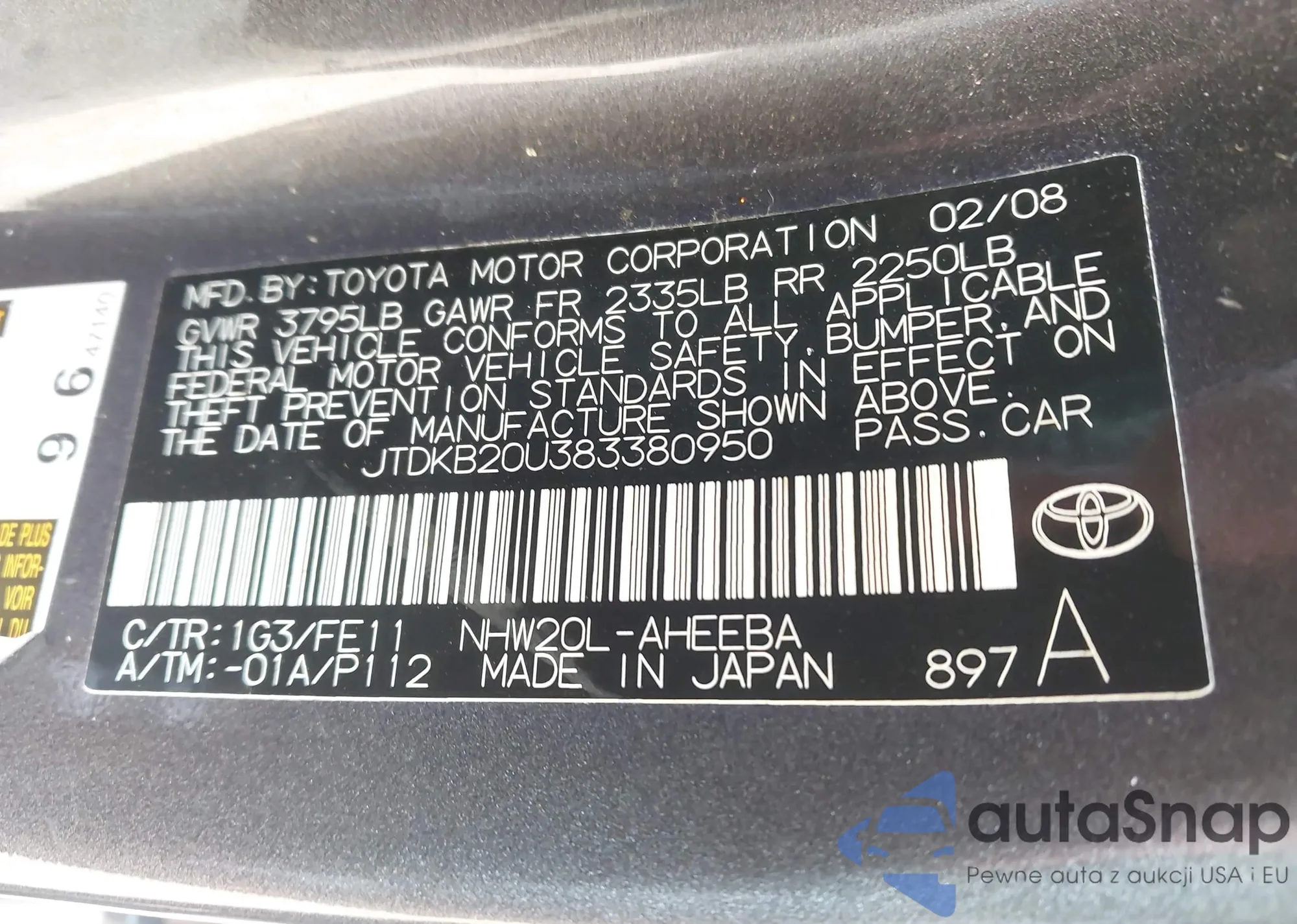 LOT: 44344494 VIN: JTDKB20U383380950