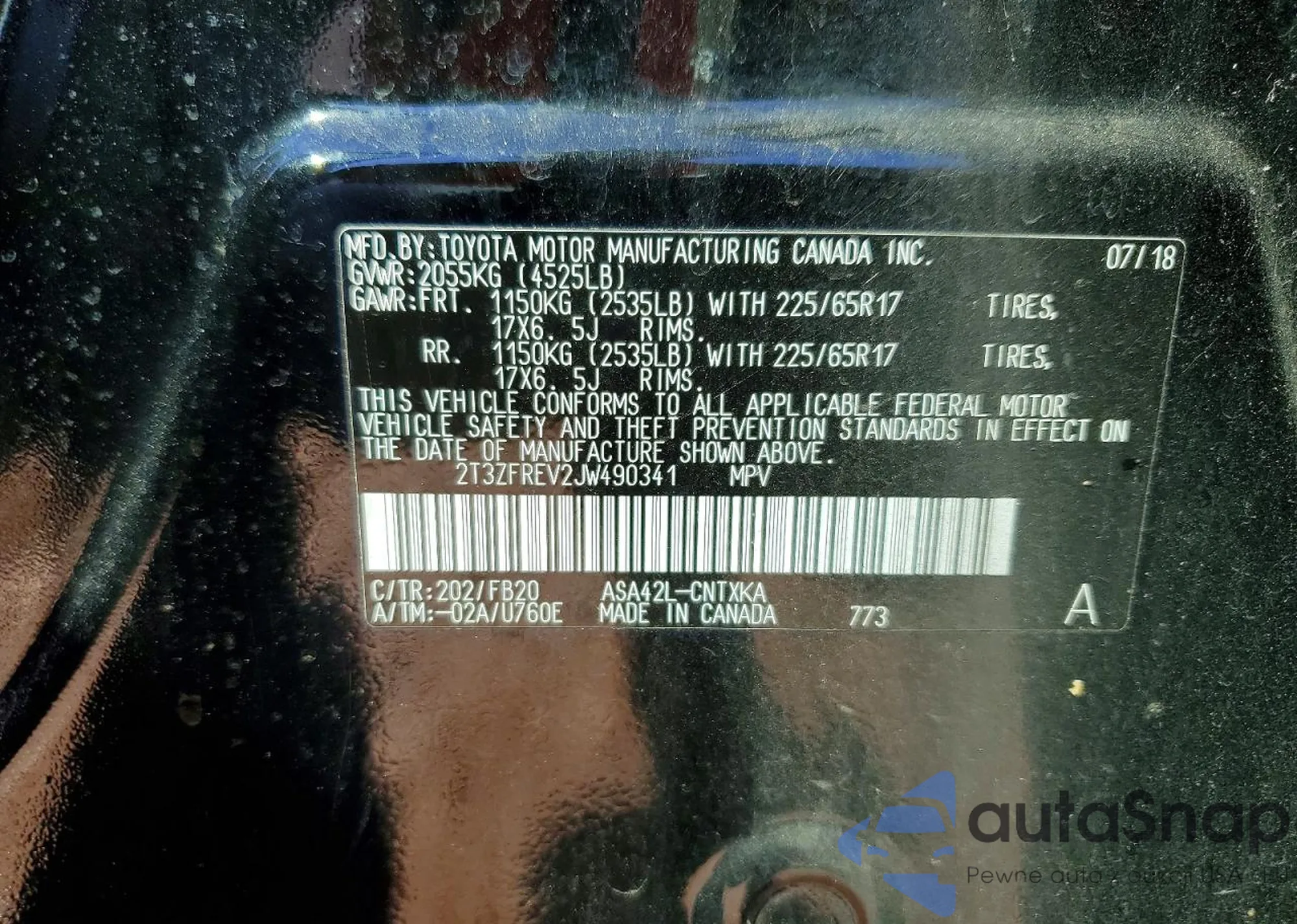 • VIN 2T3ZFREV2JW490341