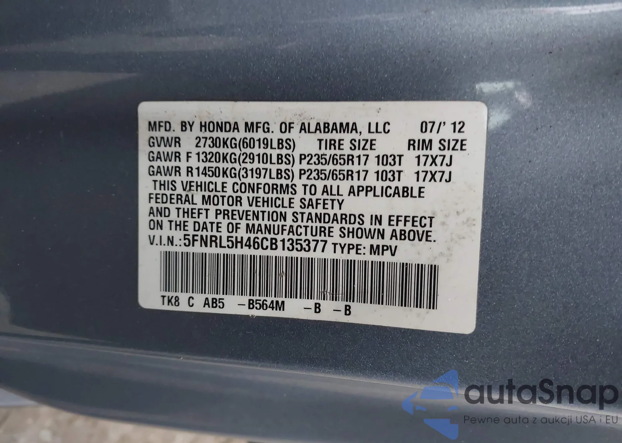 • VIN 5FNRL5H46CB135377