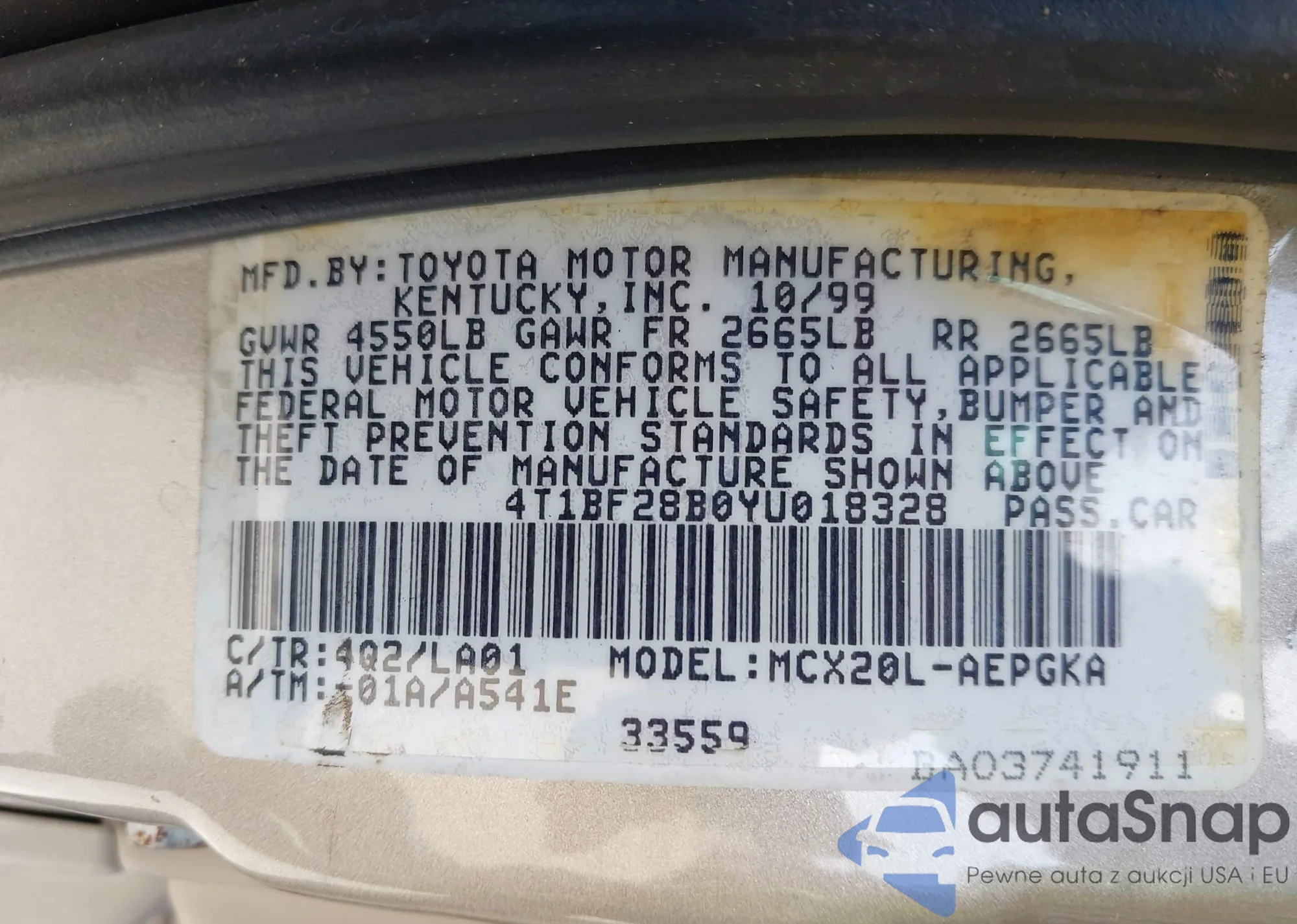 LOT: 44553737 VIN: 4T1BF28B0YU018328