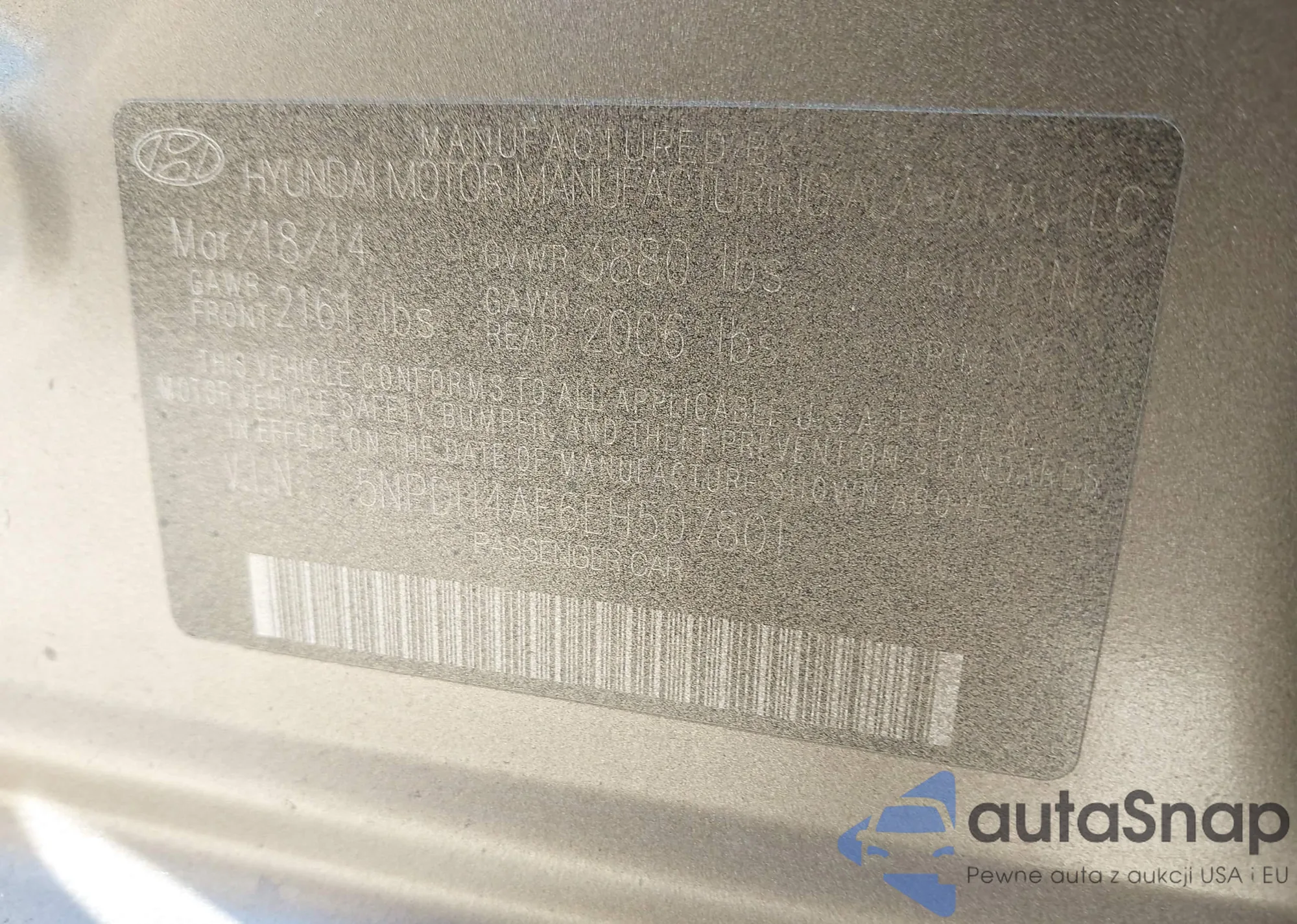 LOT: 44335685 VIN: 5NPDH4AE6EH507801