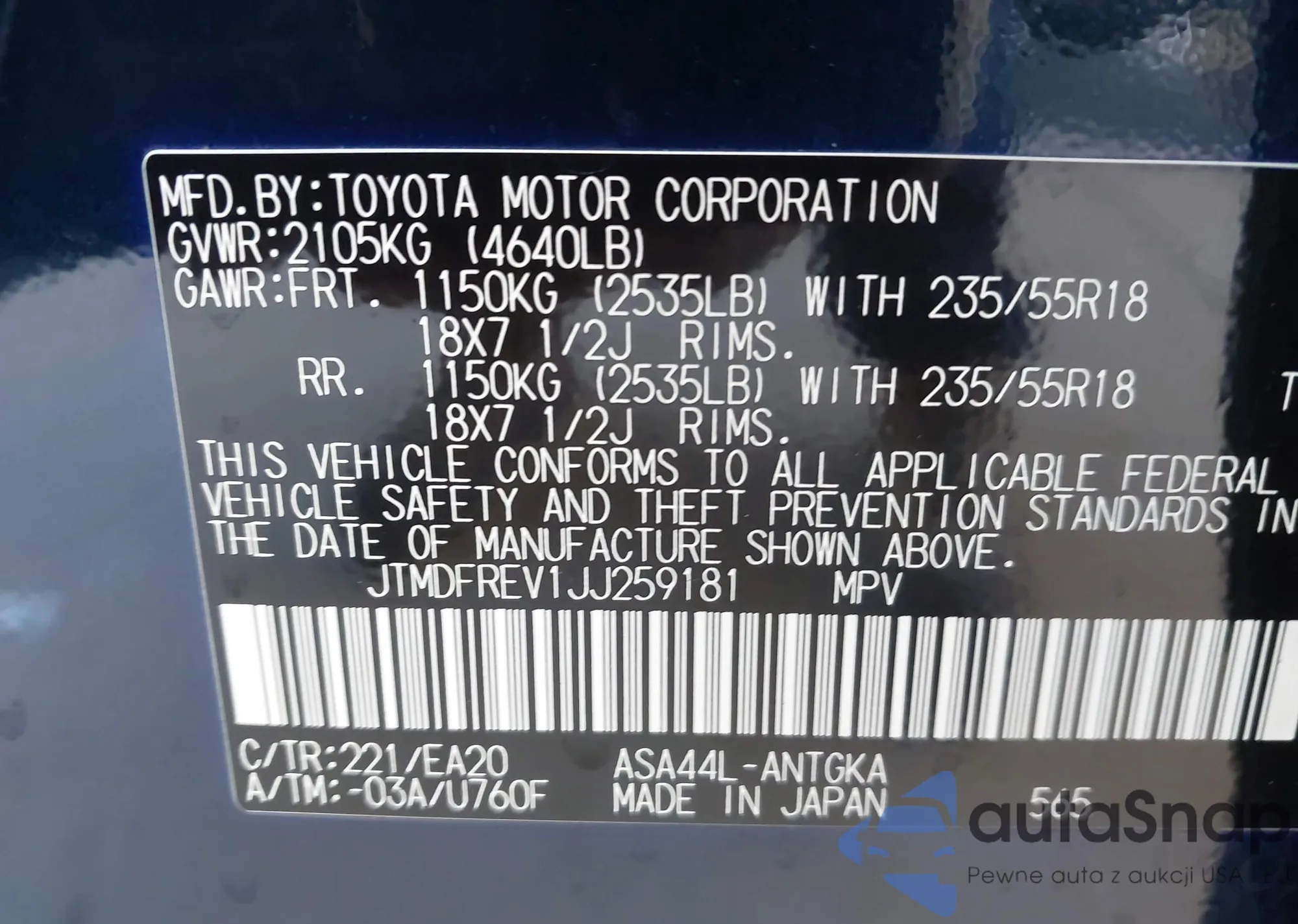 LOT: 44376527 VIN: JTMDFREV1JJ259181