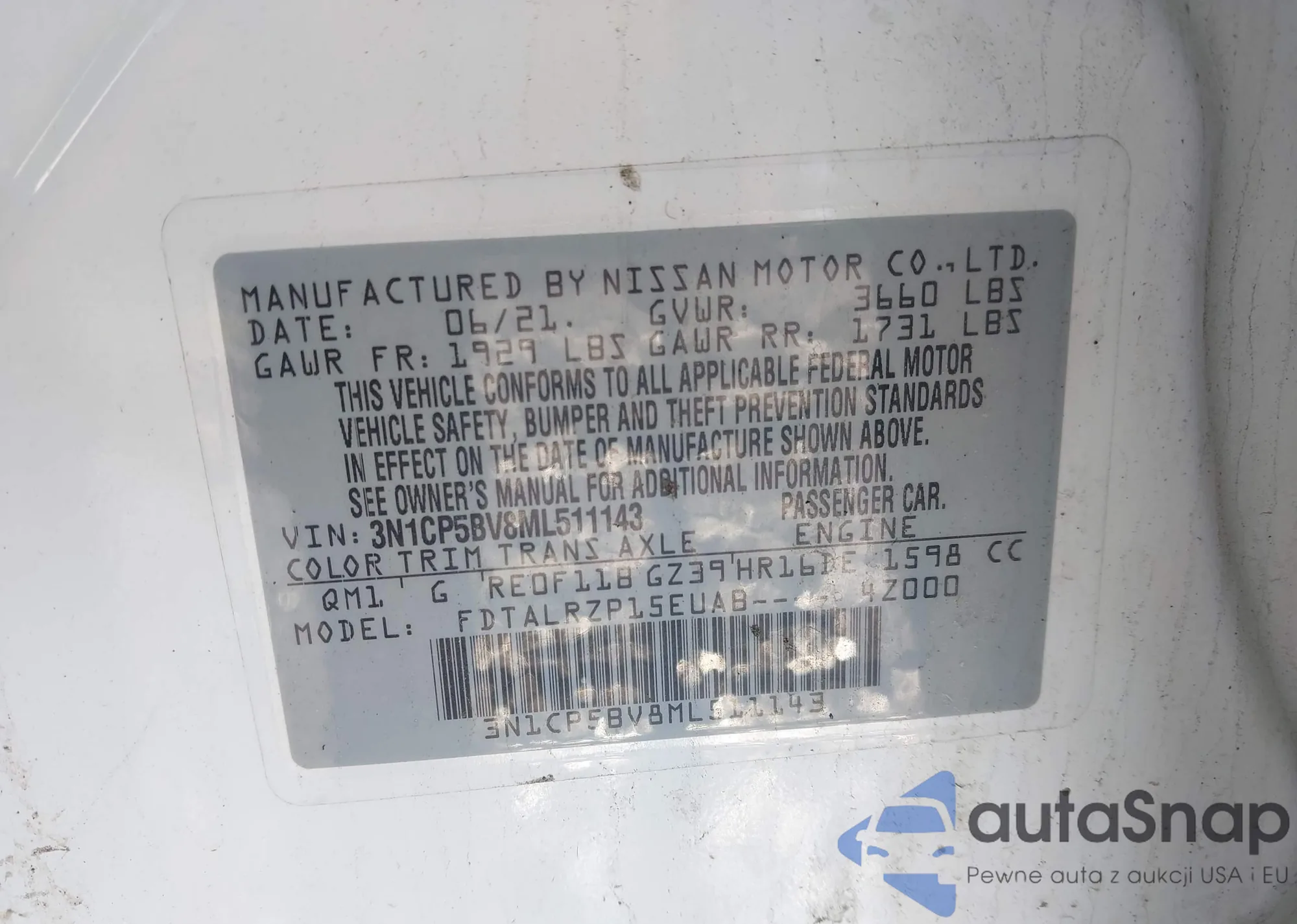 • VIN 3N1CP5BV8ML511143