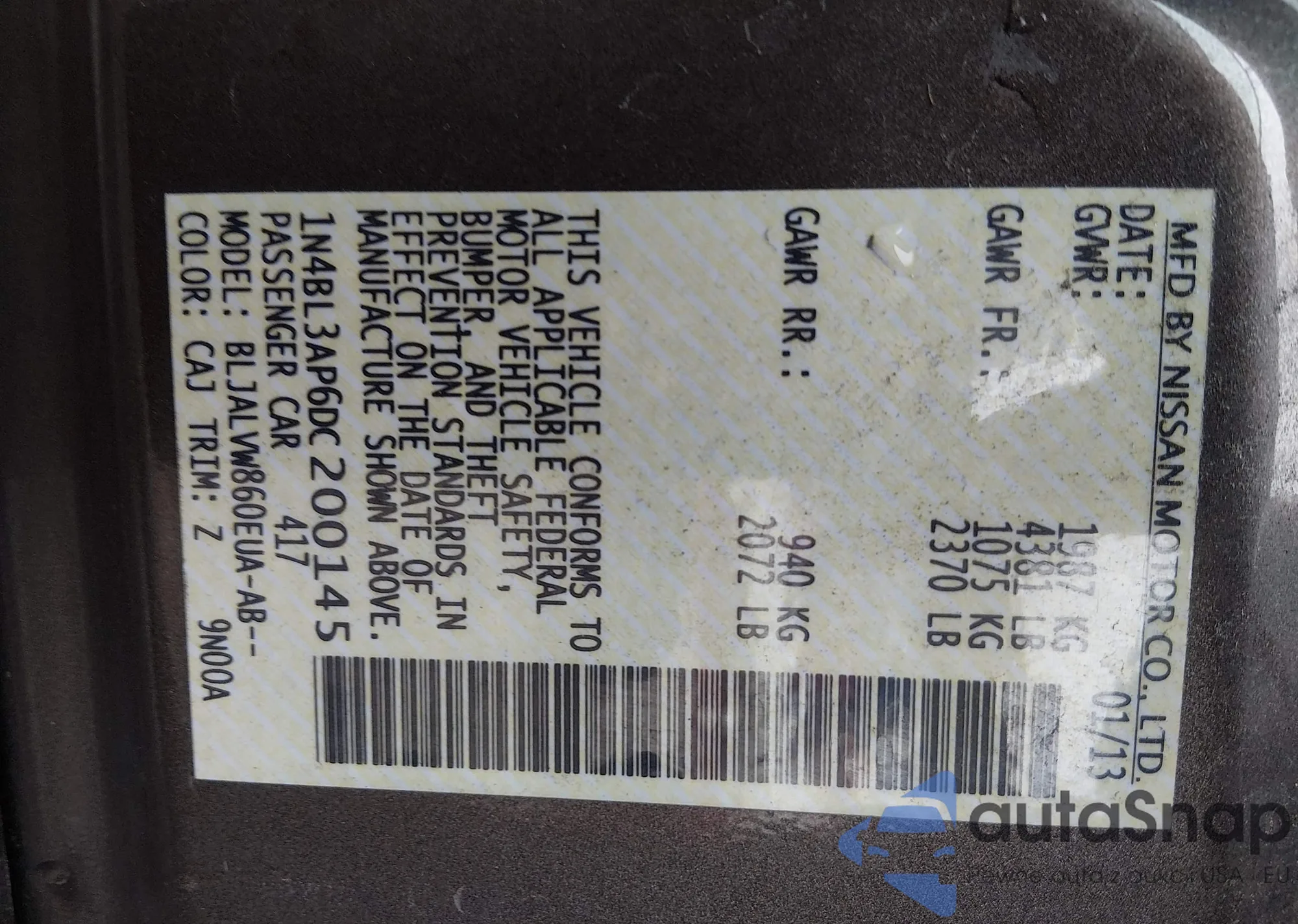 • VIN 1N4BL3AP6DC200145