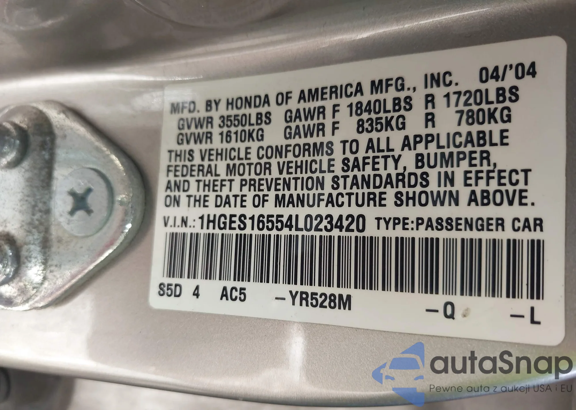 LOT: 44556549 VIN: 1HGES16554L023420