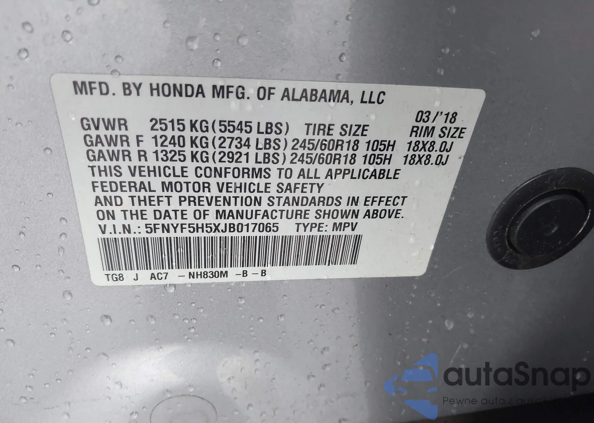 • VIN 5FNYF5H5XJB017065