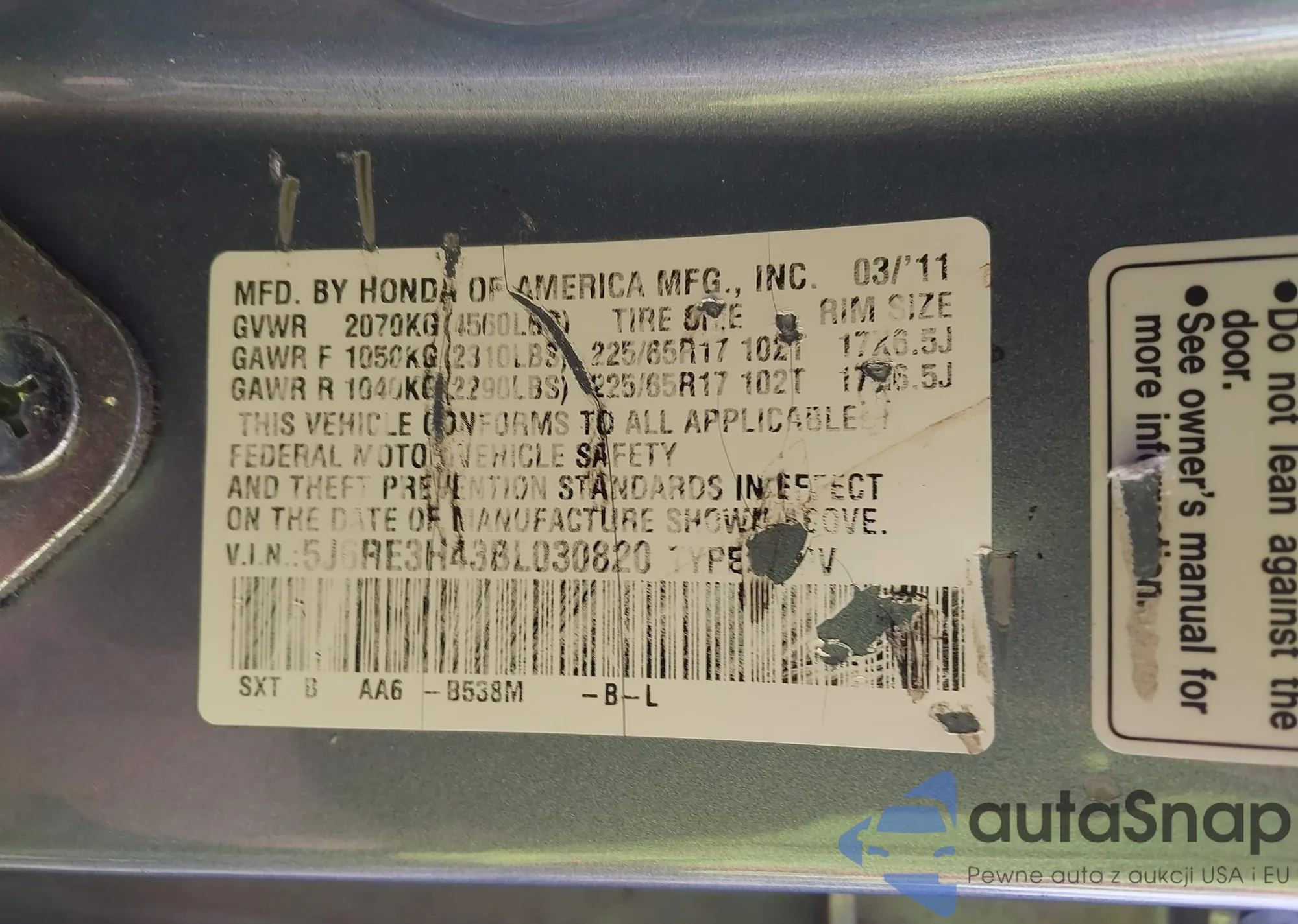 • VIN 5J6RE3H43BL030820