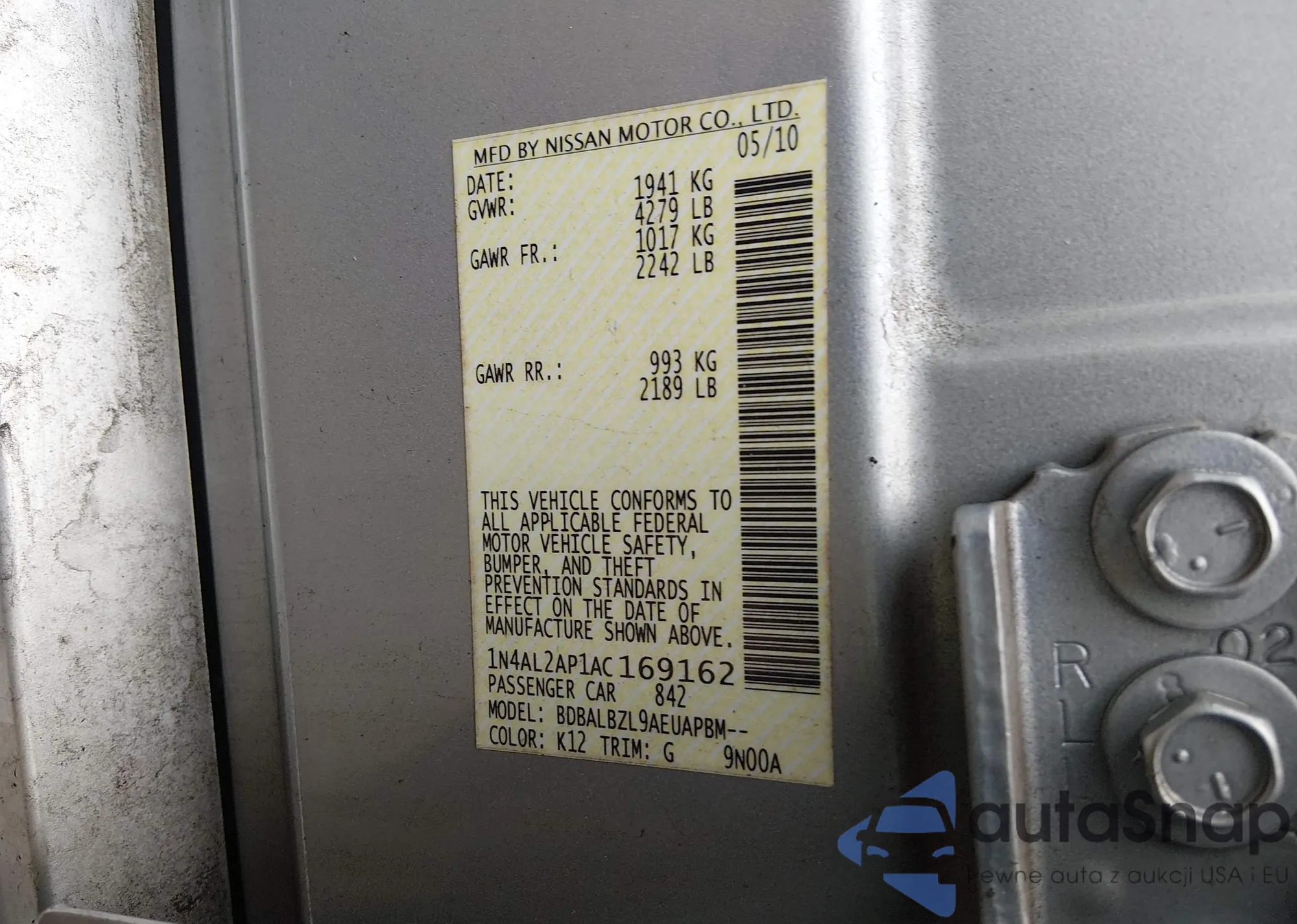 LOT: 44543462 VIN: 1N4AL2AP1AC169162