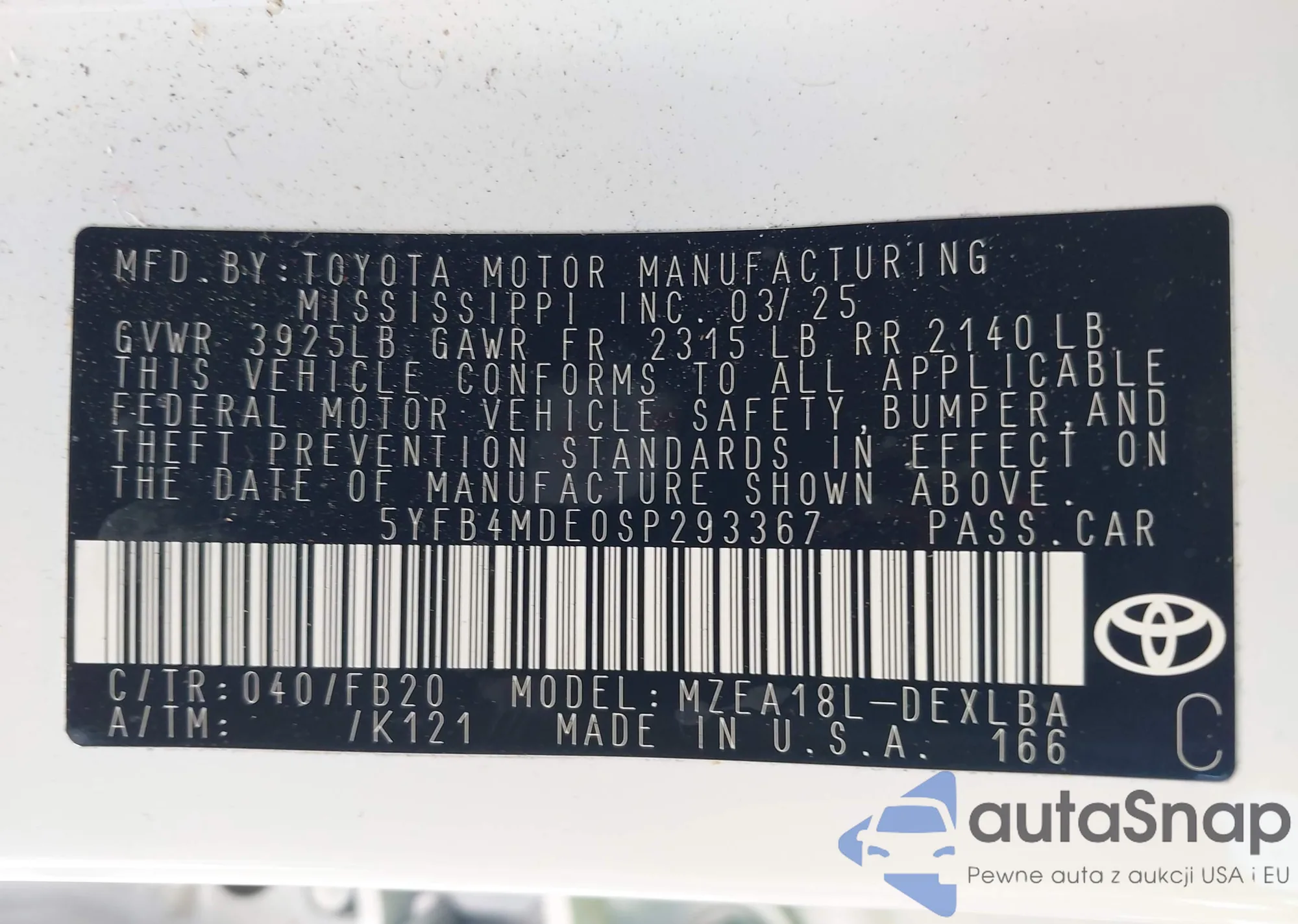 • VIN 5YFB4MDE0SP293367