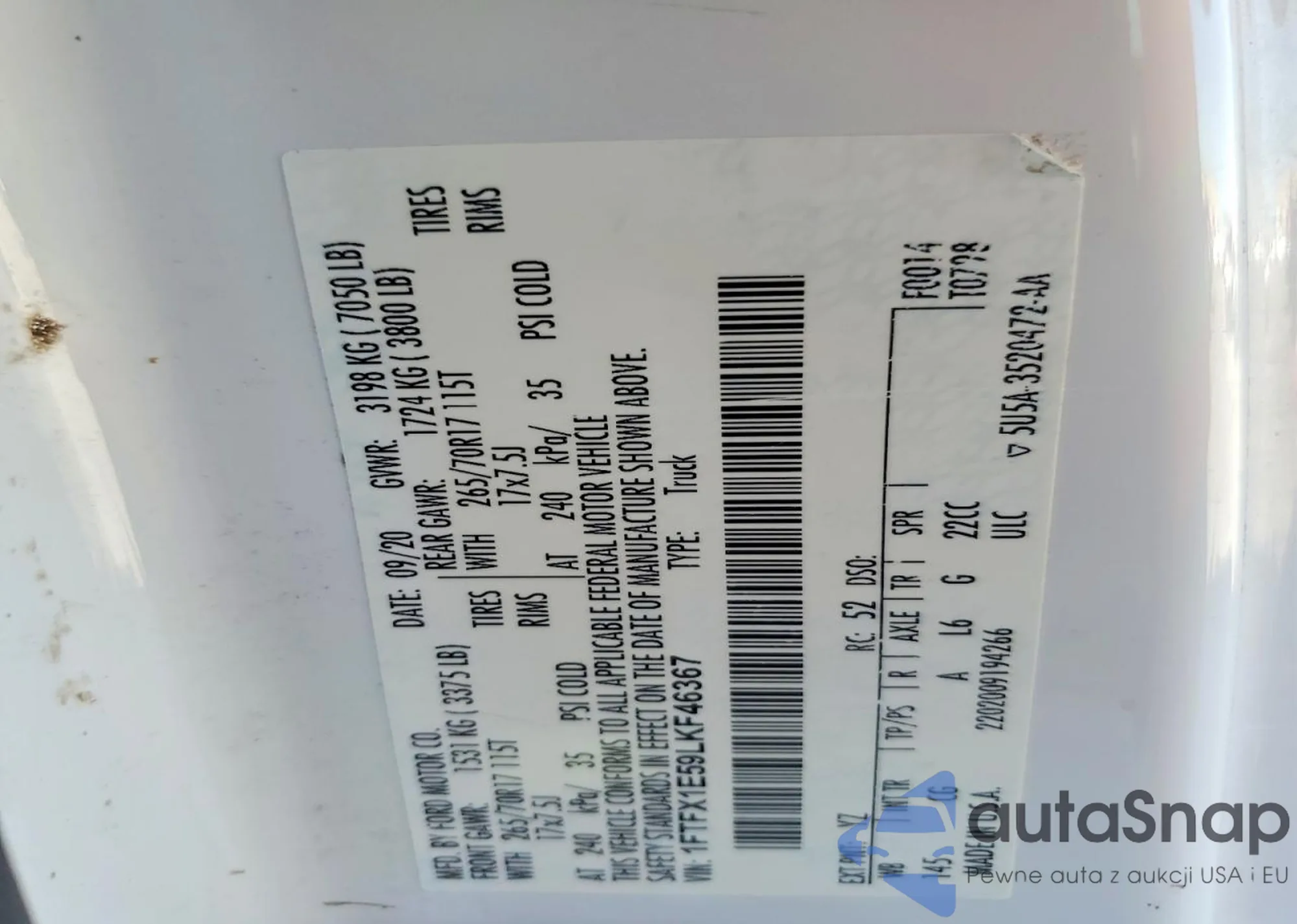 LOT: 78498325 VIN: 1FTFX1E59LKF46367
