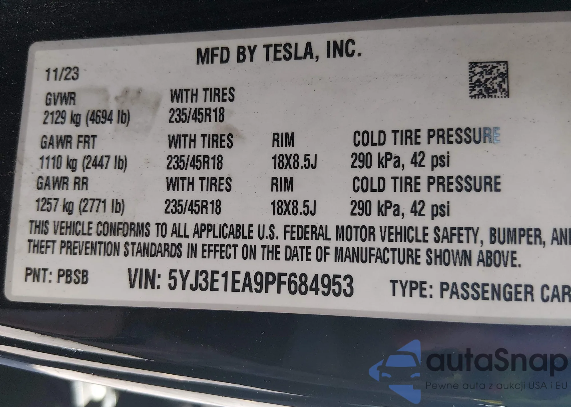 • VIN 5YJ3E1EA9TF684953