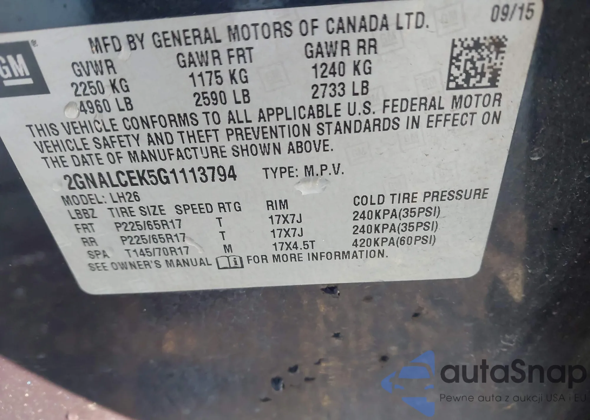 LOT: 43972154 VIN: 2GNALCEK5G1113794
