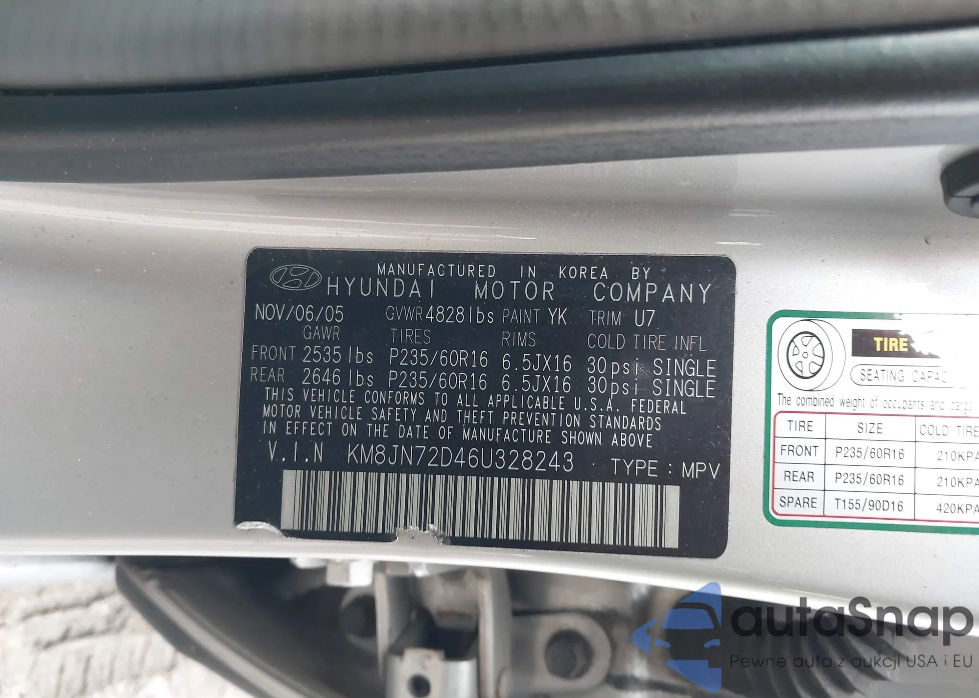 LOT: 44514300 VIN: KM8JN72D46U328243