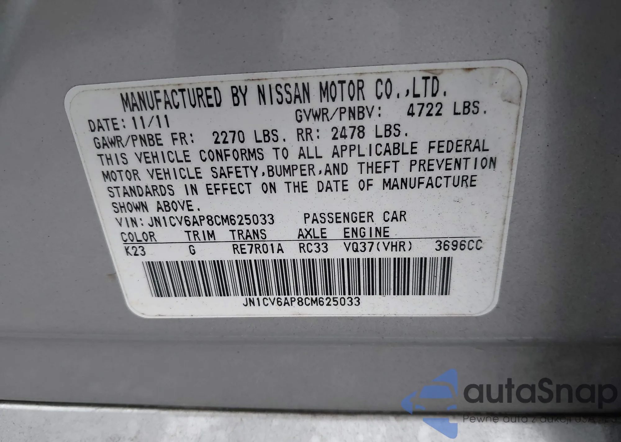 LOT: 44623840 VIN: JN1CV6AP8CM625033