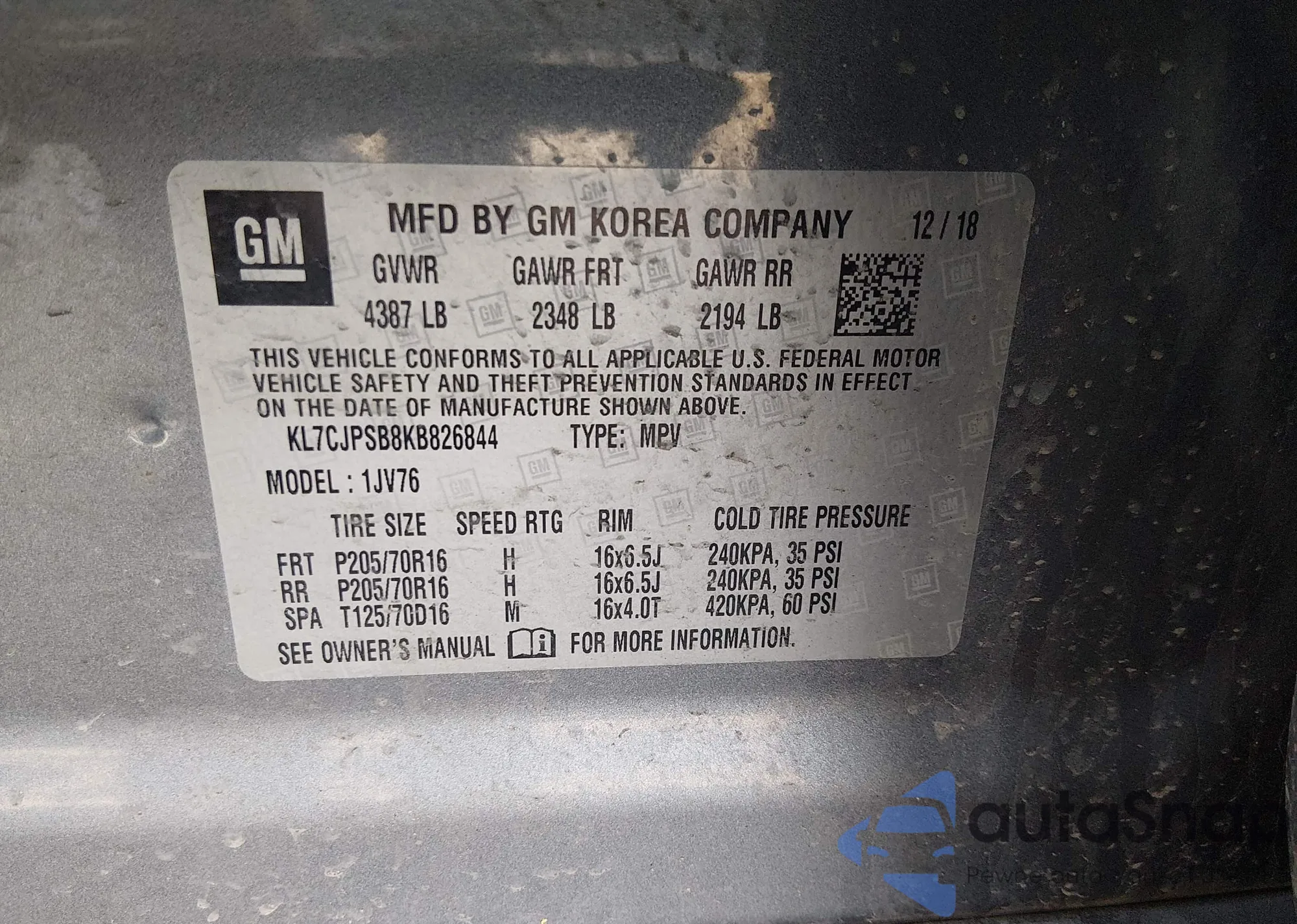 LOT: 44501418 VIN: KL7CJPSB8KB826844