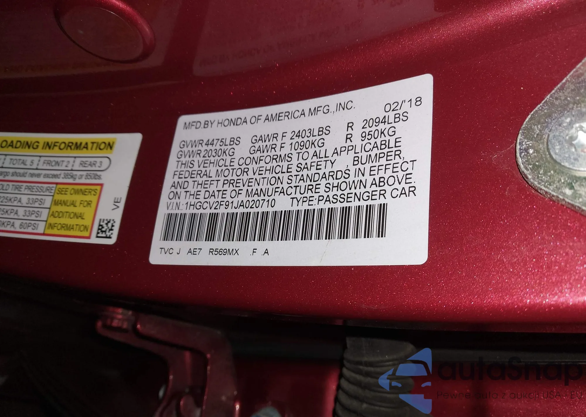 • VIN 1HGCV2F91JA020710