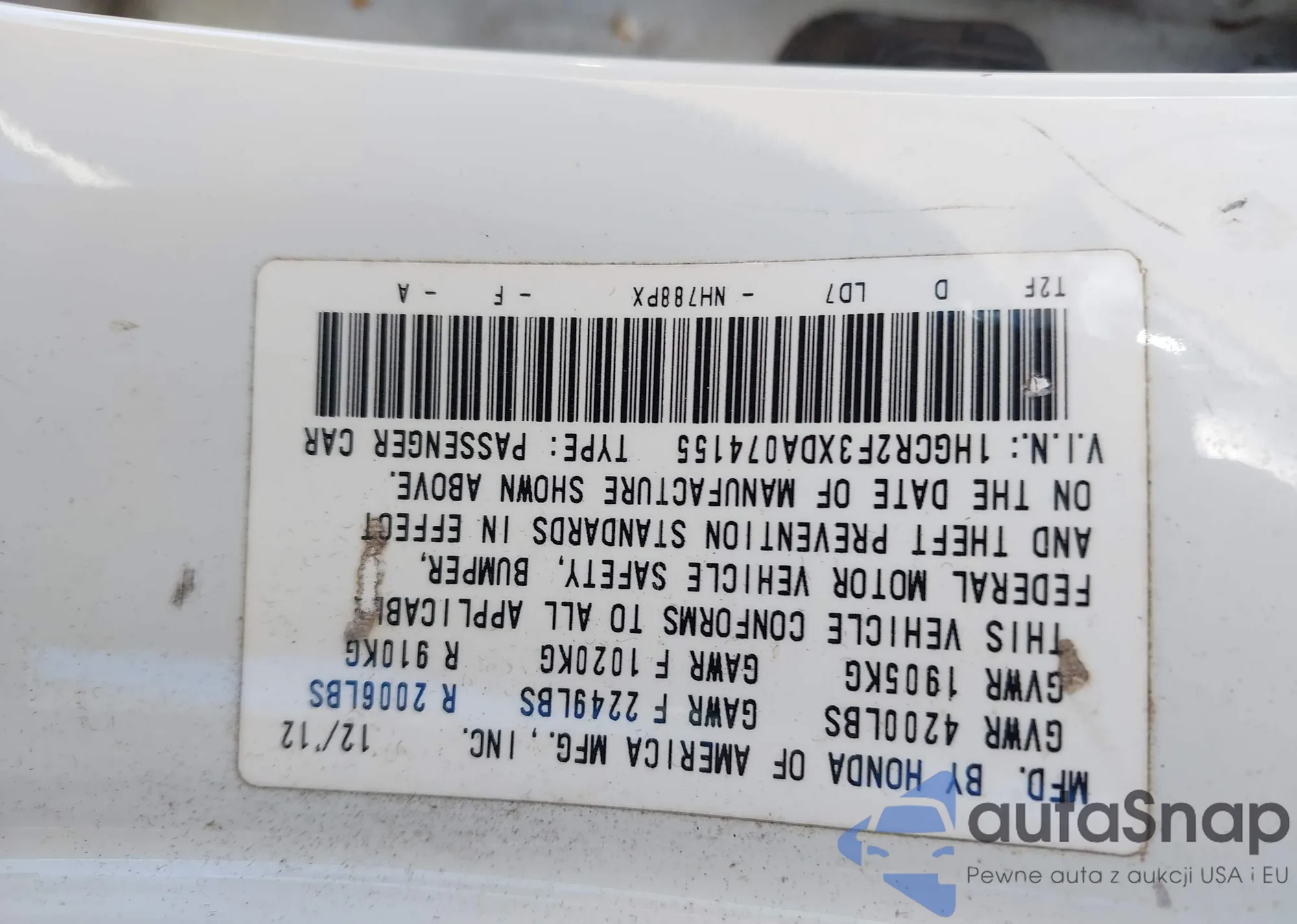• VIN 1HGCR2F3XDA074155