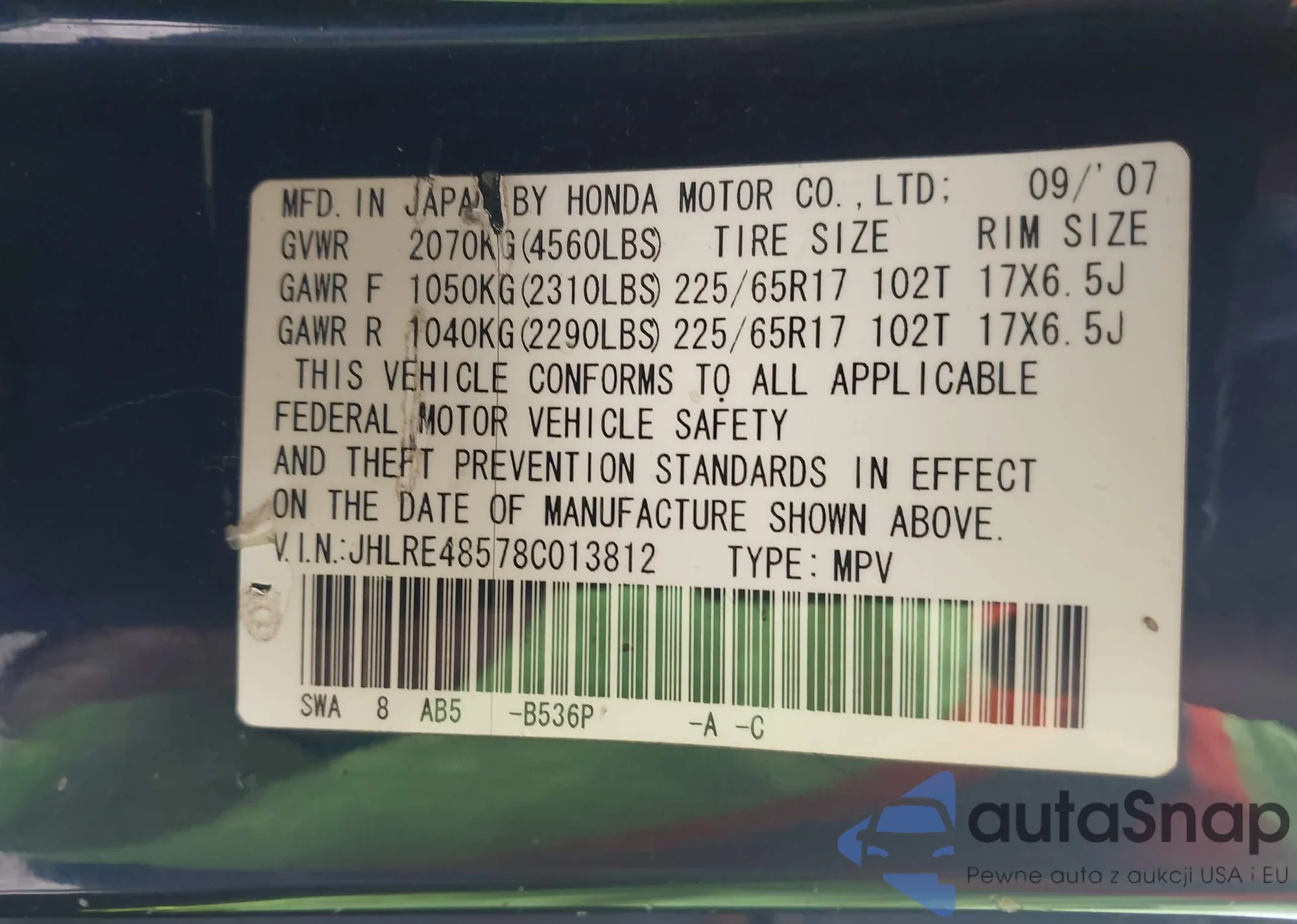 • VIN JHLRE48578C013812