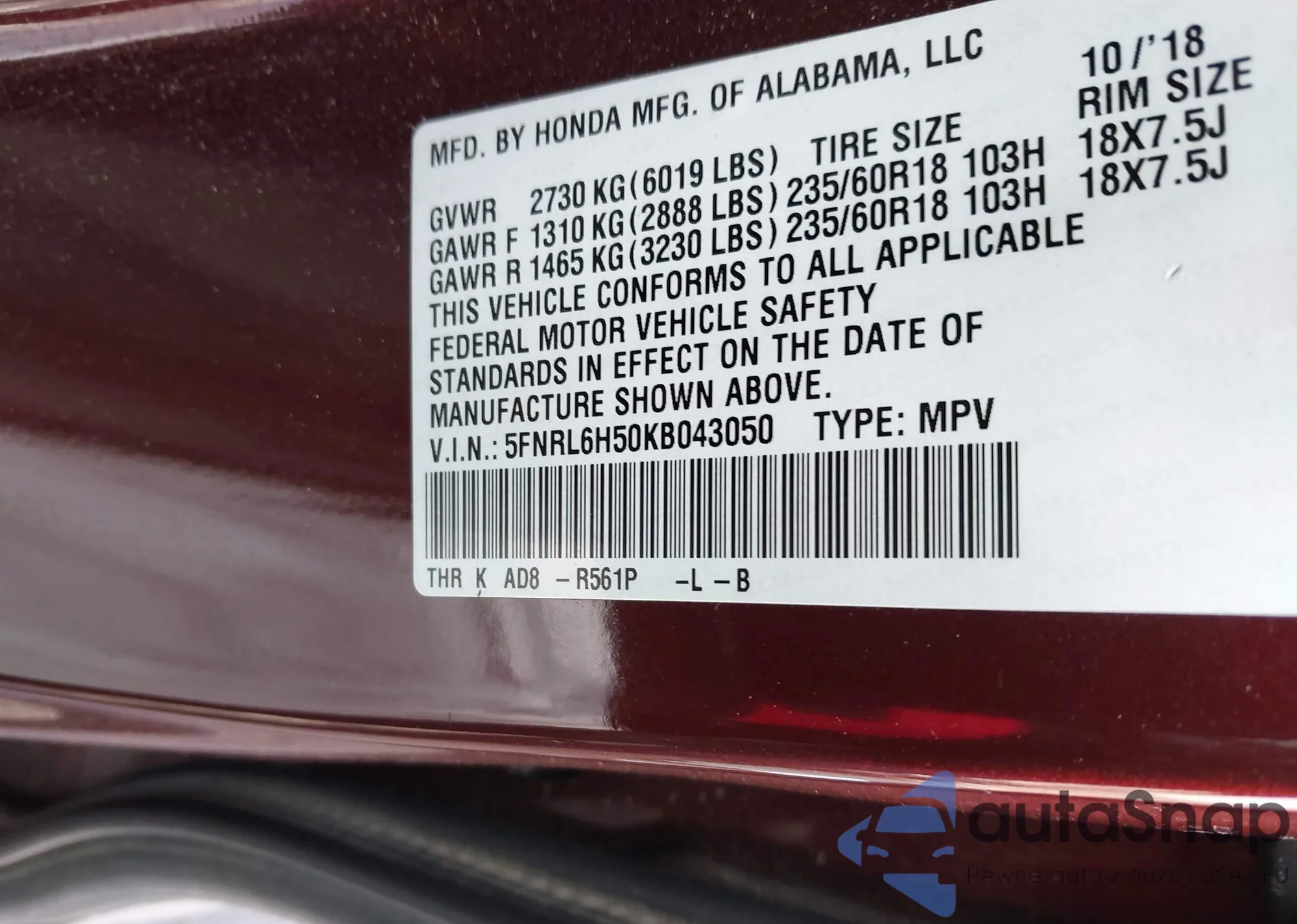 LOT: 44003422 VIN: 7FARS4H78PE013606