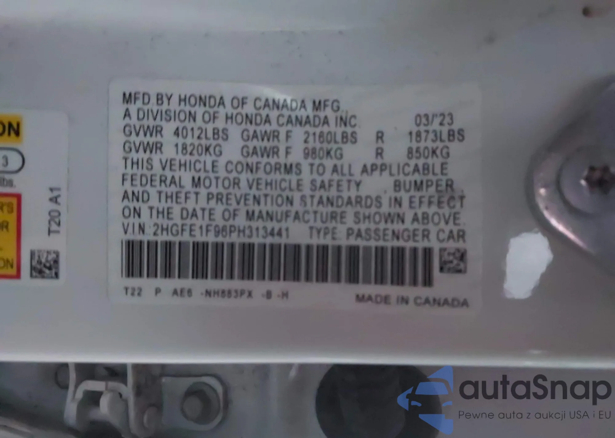 LOT: 44235858 VIN: 2HGFE1F96PH313441