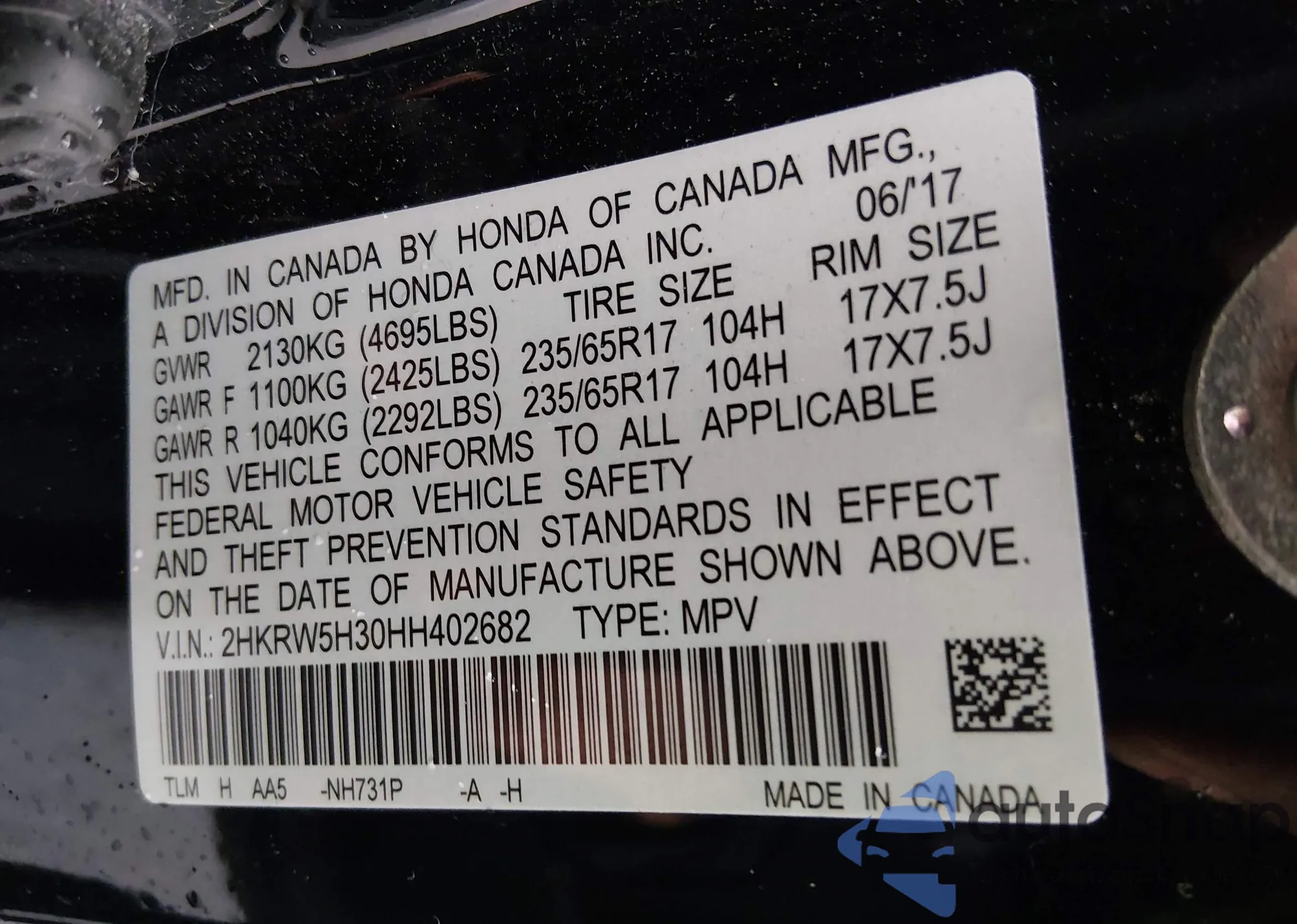 • VIN 2HKRW5H30HH402682