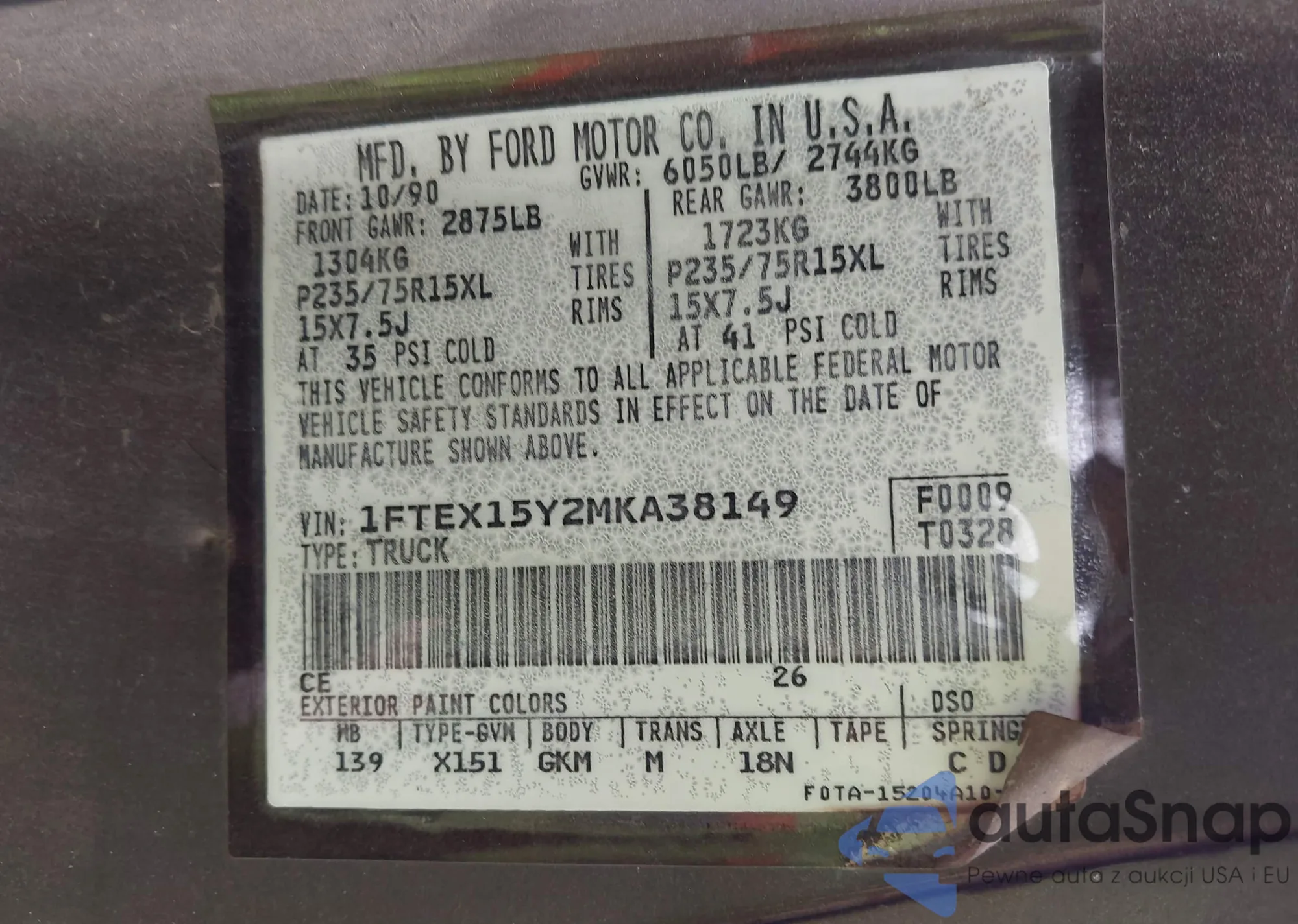 Автомобиль Ford F-150 1991 (VIN 1FTEX15Y2MKA38149) ранее не участвовал в торгах. Документы чистые, пробег соответствует или ниже среднего по рынку. Продаётся страховой компанией — рекомендуем покупку. Доставка в порт займет около 6–8 недель.