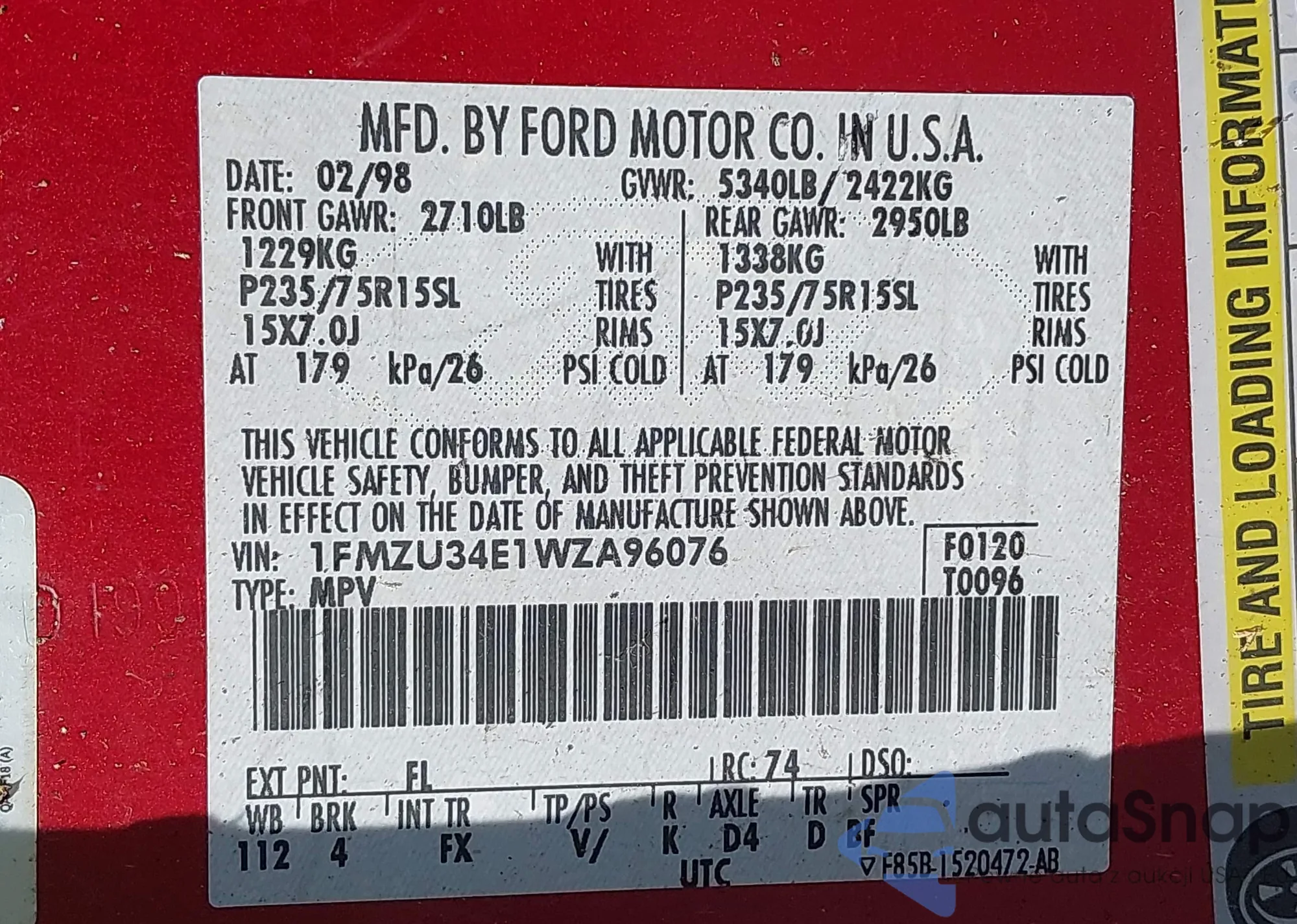 • VIN: 1FMZU34E1WZA96076