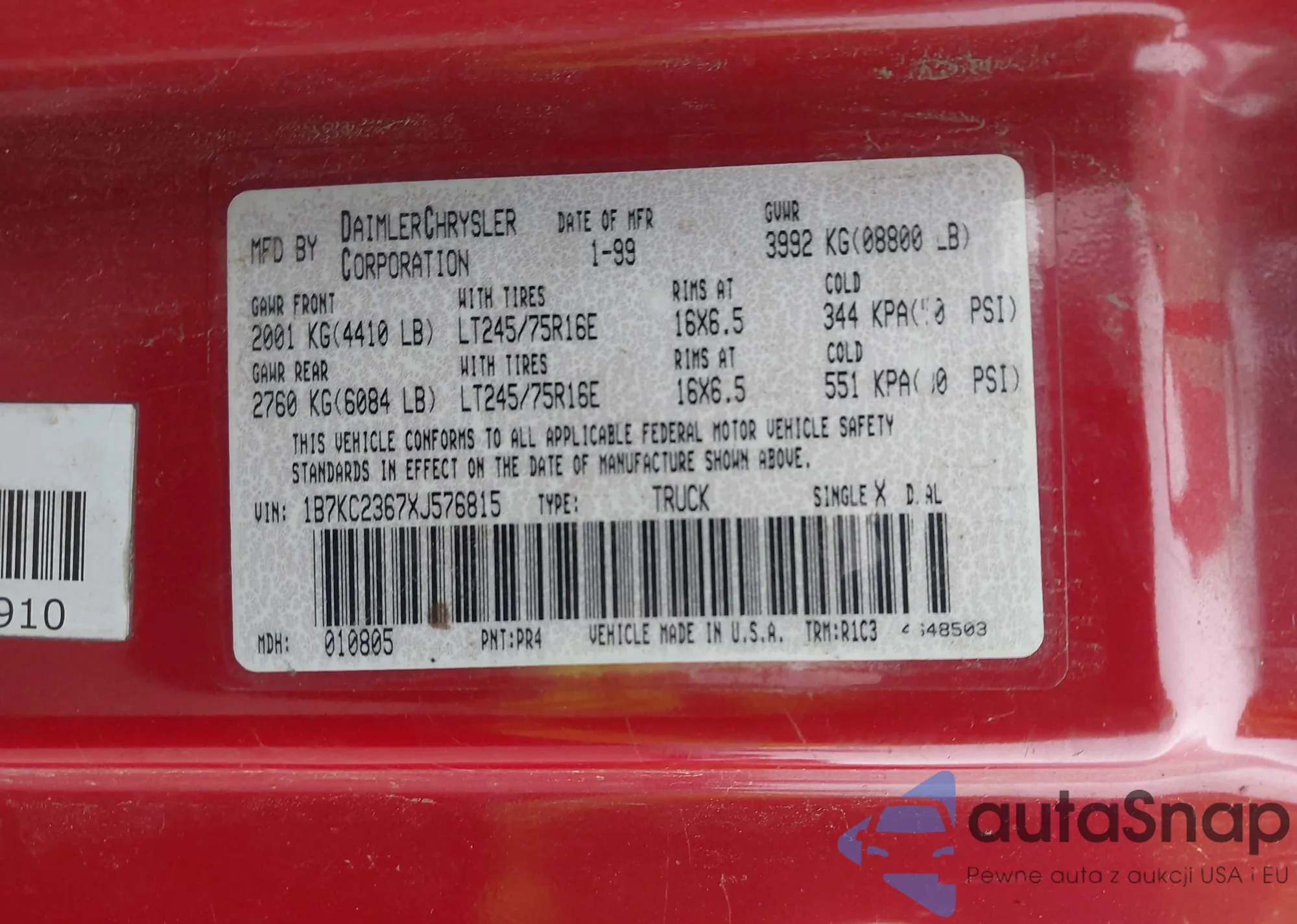 • VIN: 1B7KC2367XJ576815