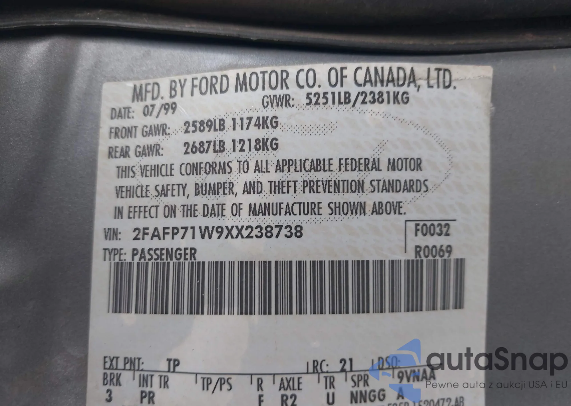 • VIN: 2FAFP71W9XX238738