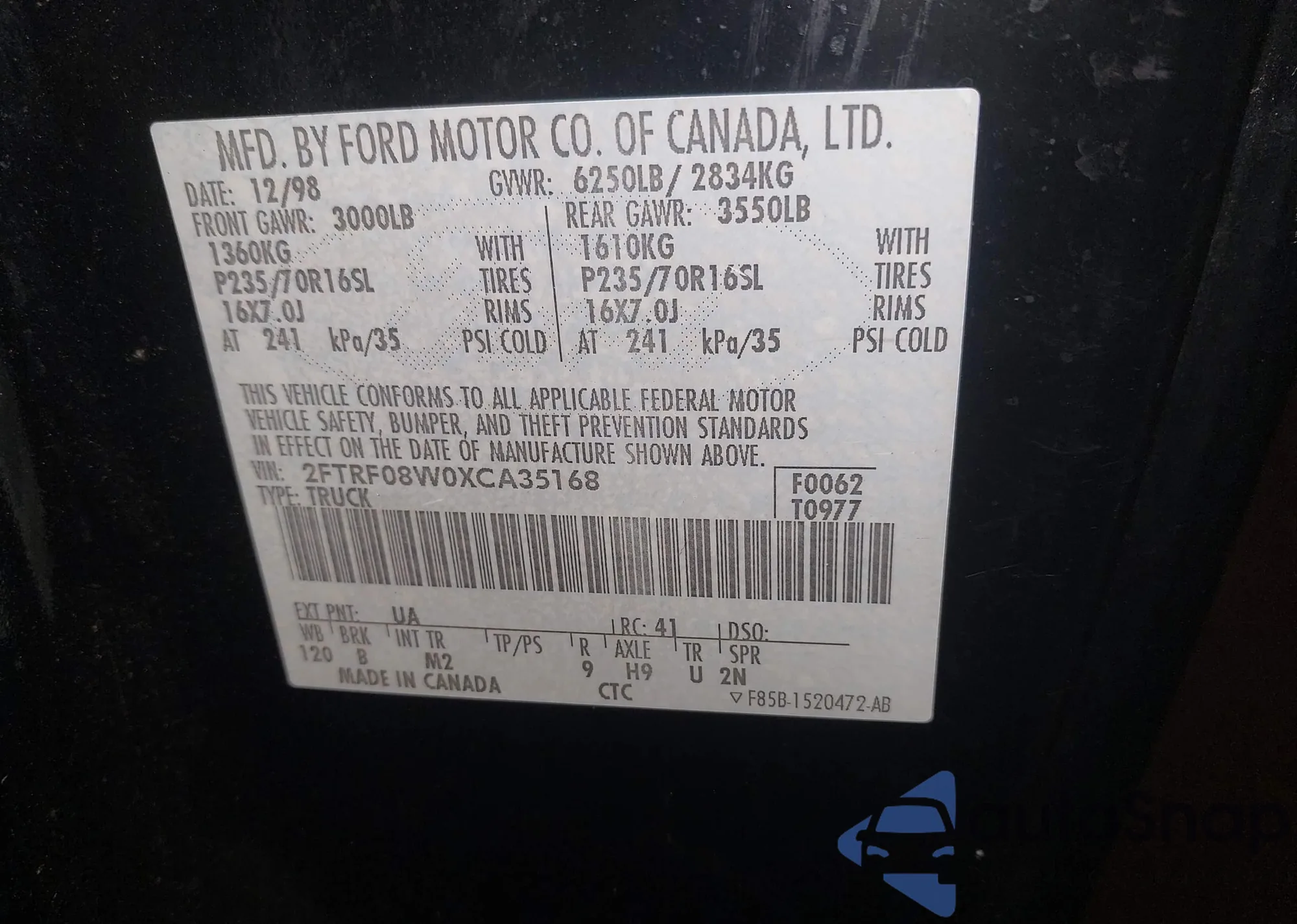• VIN: 2FTRF08W0XCA35168
