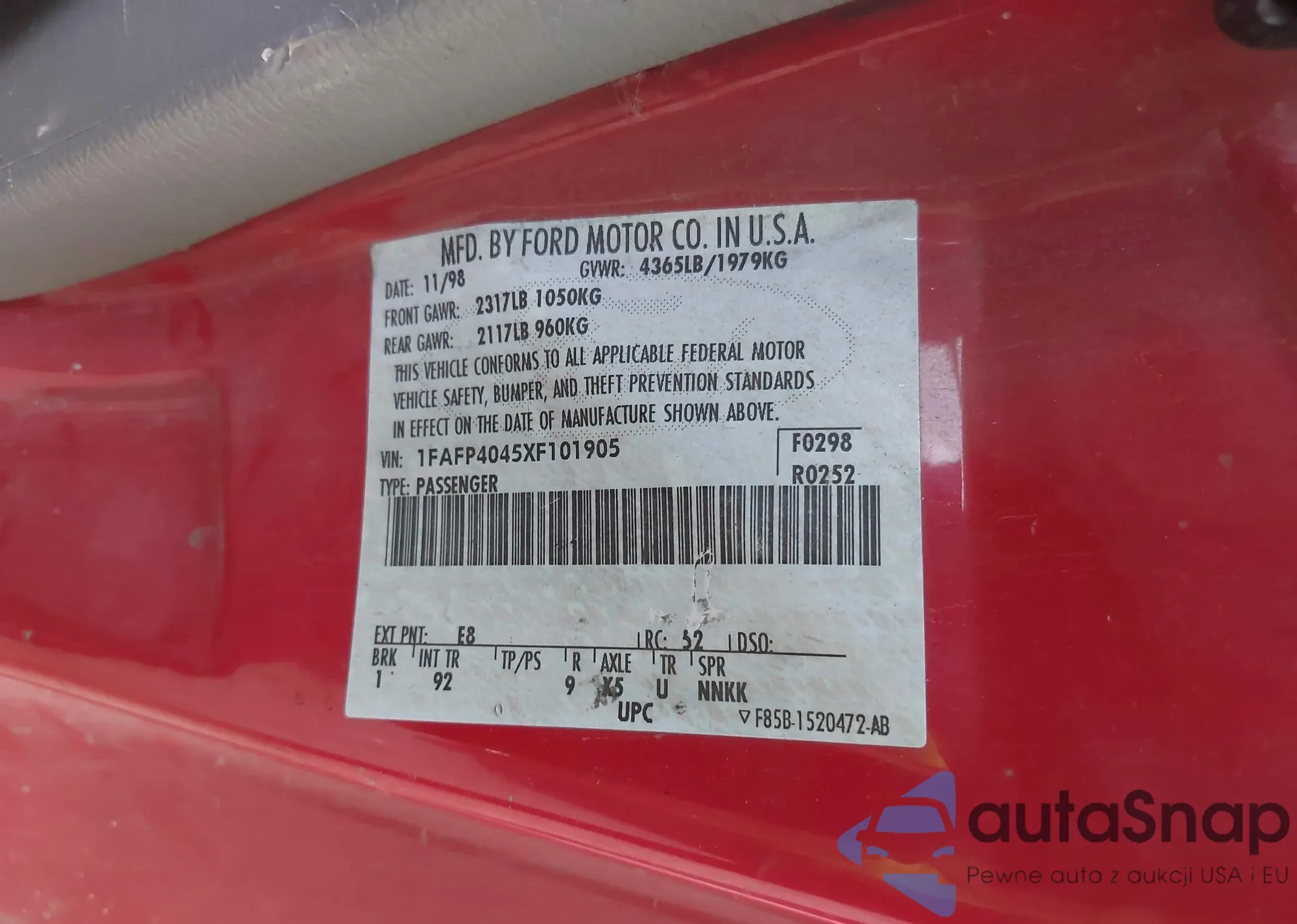 Автомобиль Ford Mustang 1999 (VIN 1FAFP4045XF101905) ранее не участвовал в торгах. Документы чистые, пробег соответствует или ниже среднего по рынку. Продаётся страховой компанией — рекомендуем покупку. Доставка в порт займет около 6–8 недель.