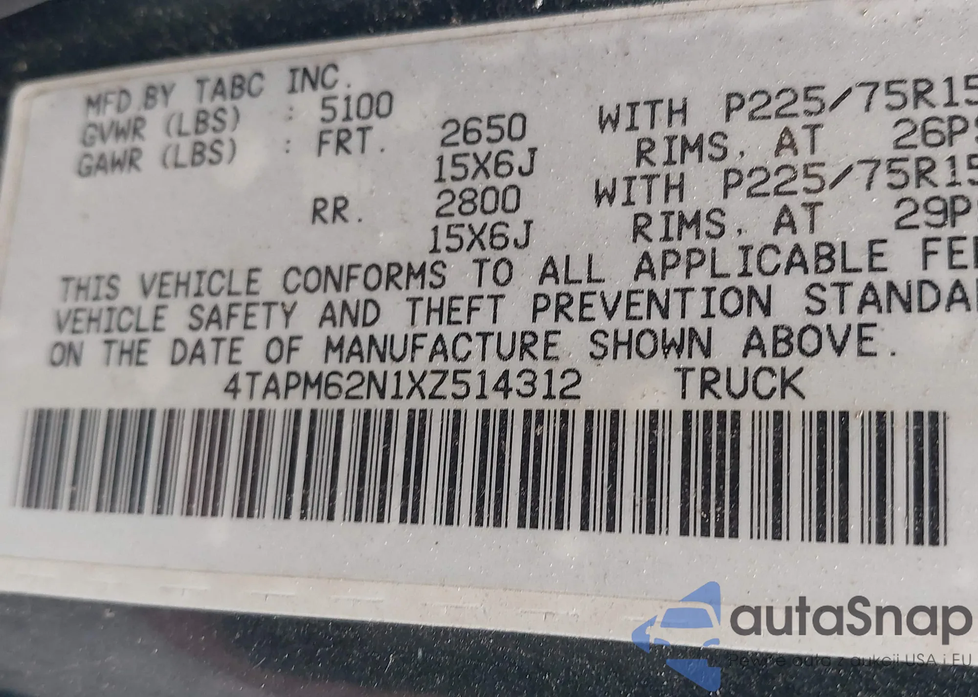 VIN: 4TAPM62N1XZ514312