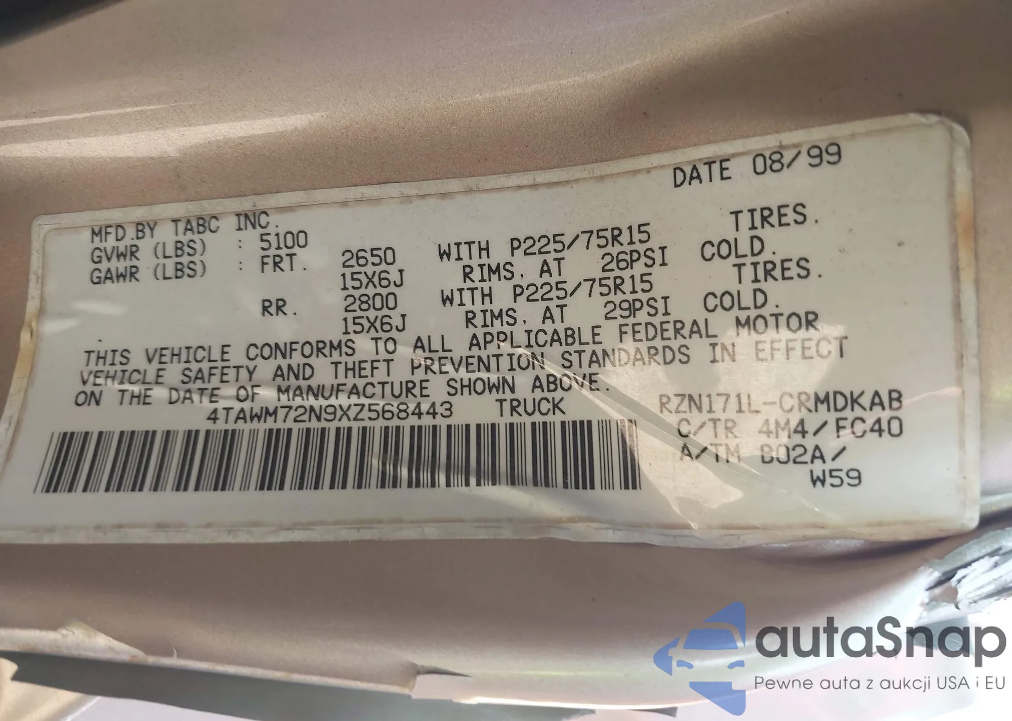 VIN: 4TAWM72N9XZ568443