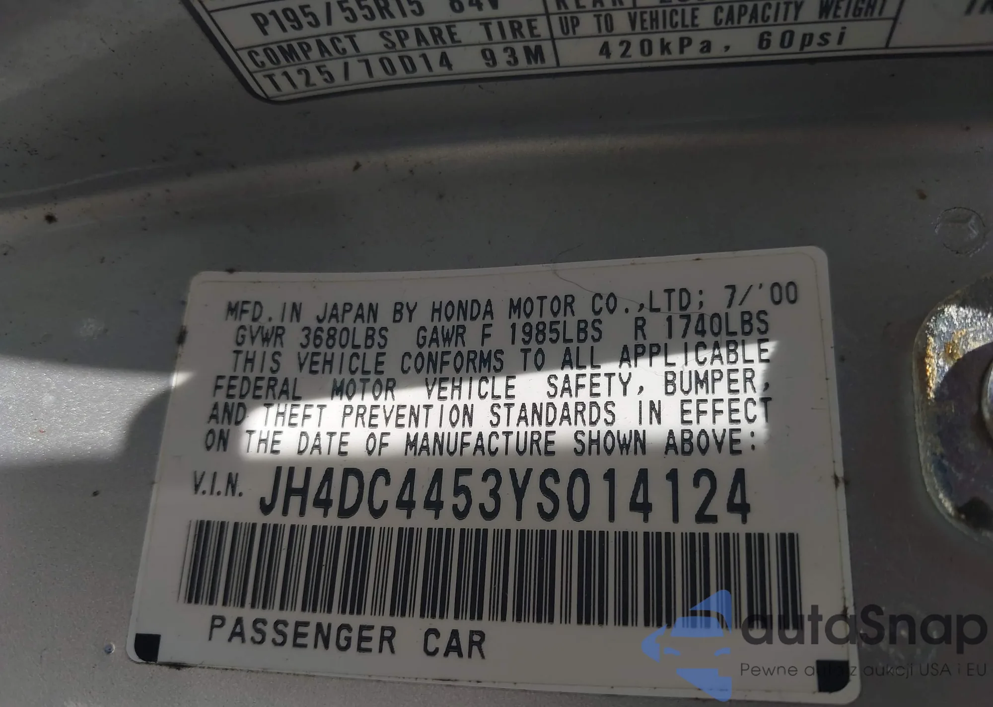 Автомобиль Acura Integra 2000 (VIN JH4DC4453YS014124) ранее не участвовал в торгах. Документы чистые, пробег соответствует или ниже среднего по рынку. Продаётся страховой компанией — рекомендуем покупку. Доставка в порт займет около 6–8 недель.