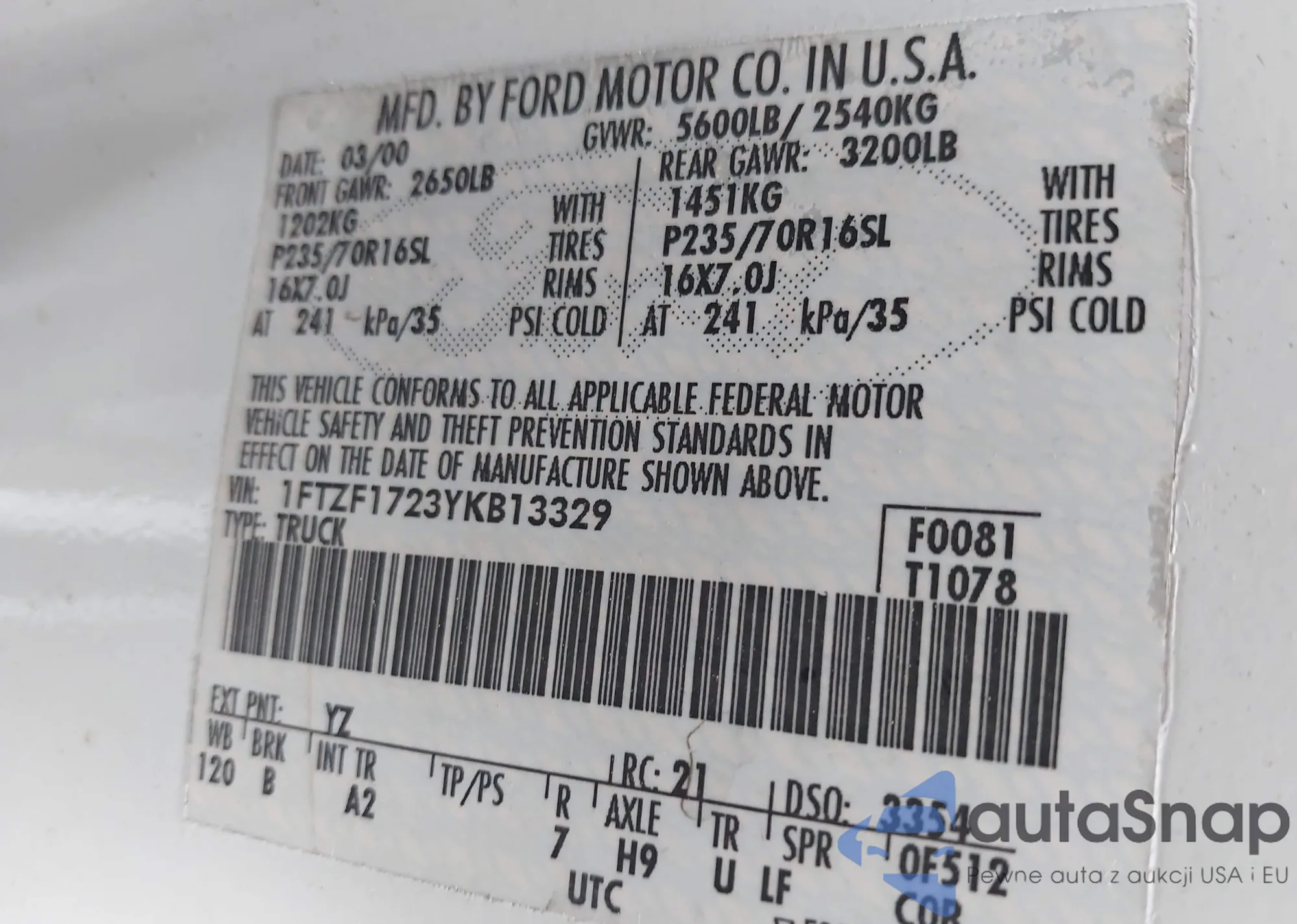 VIN: 1FTZF1723YKB13329
