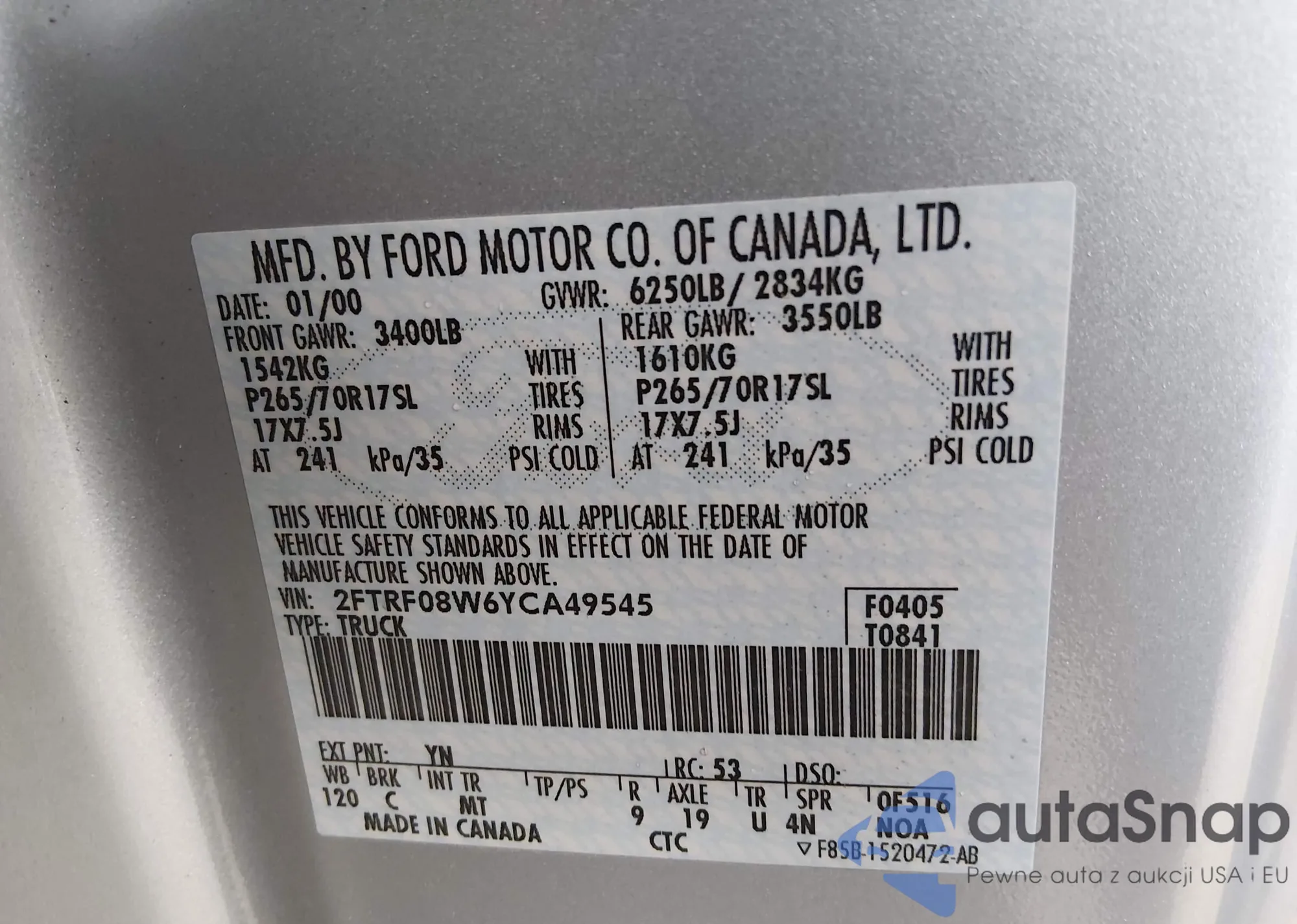 • VIN: 2FTRF08W6YCA49545