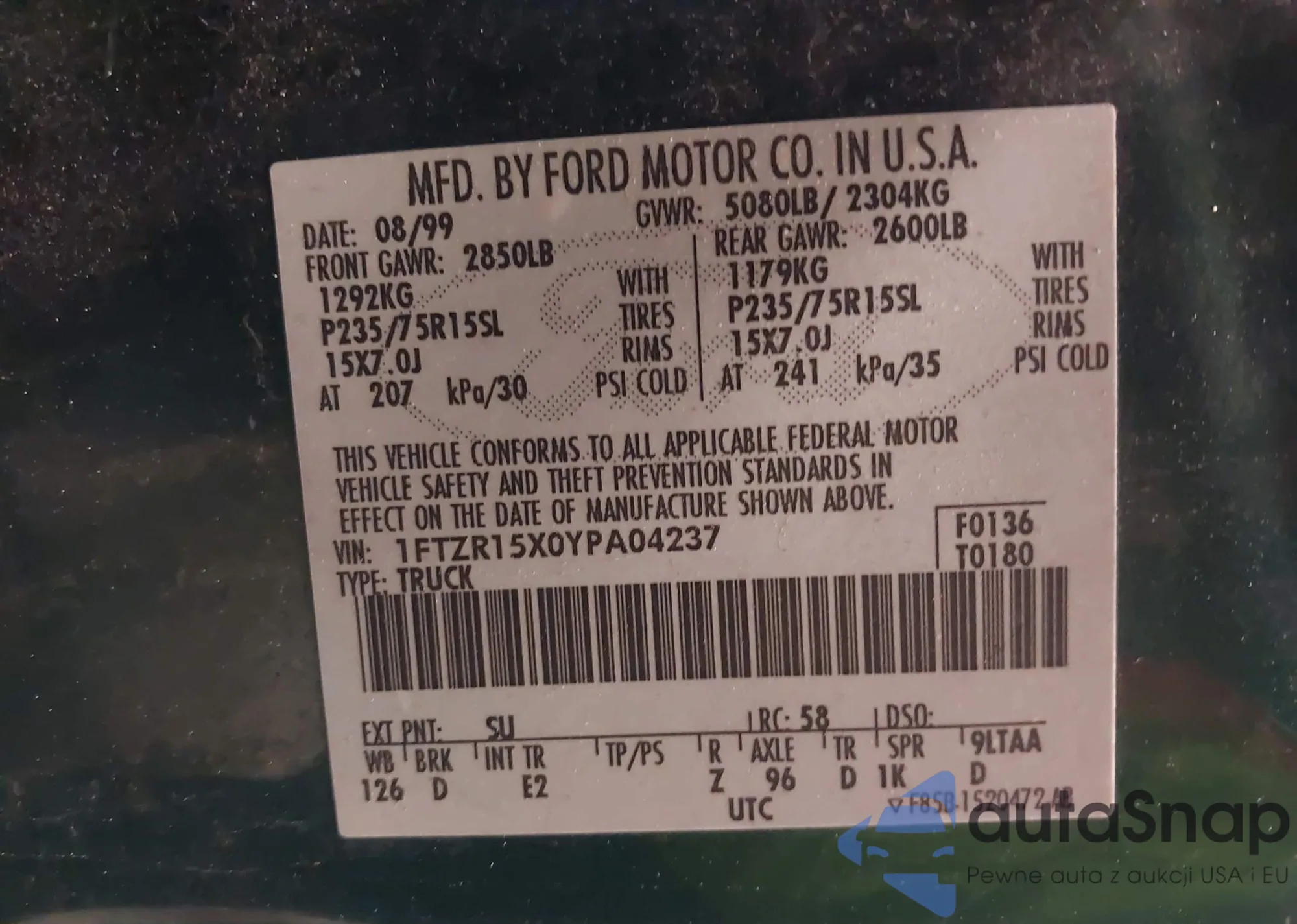 • VIN: 1FTZR15X0YPA04237
