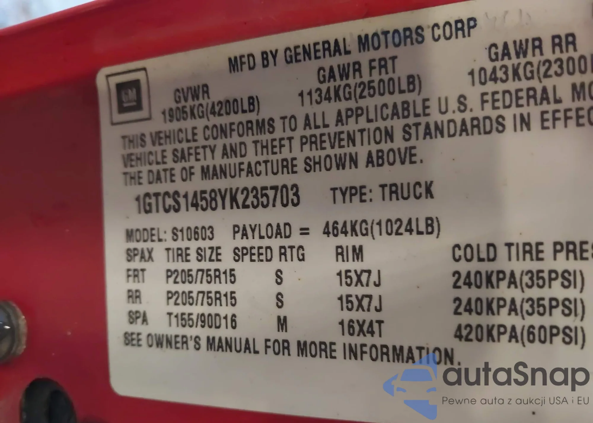 Автомобиль GMC Sonoma 2000 (VIN 1GTCS1458YK235703) ранее не участвовал в торгах. Документы чистые, пробег соответствует или ниже среднего по рынку. Продаётся страховой компанией — рекомендуем покупку. Доставка в порт займет около 6–8 недель.