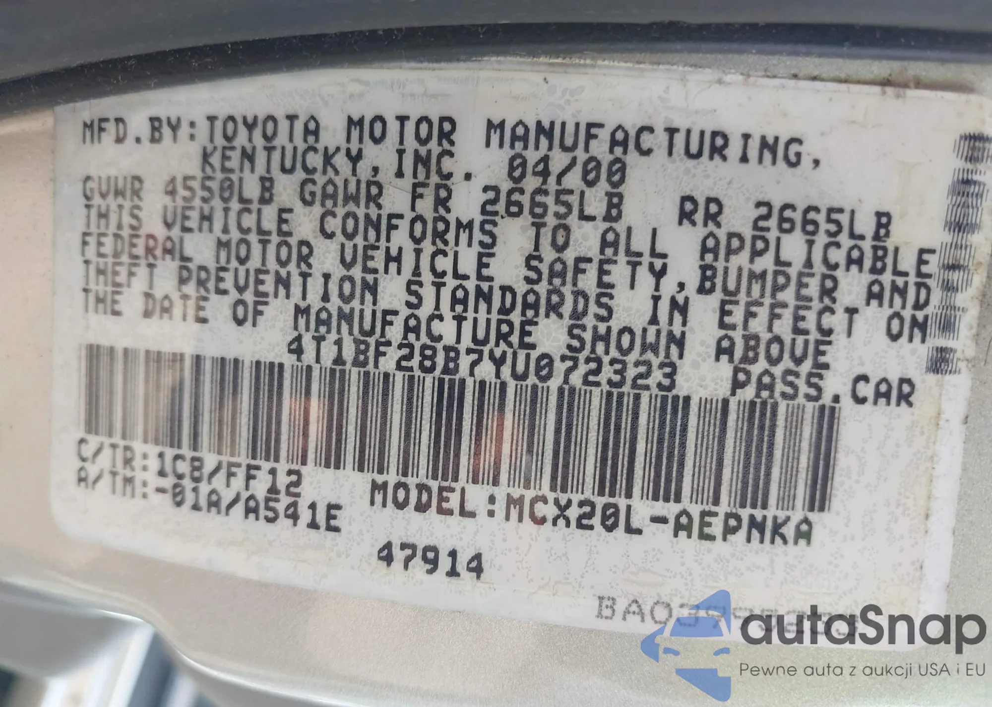 VIN: 4T1BF28B7YU072323