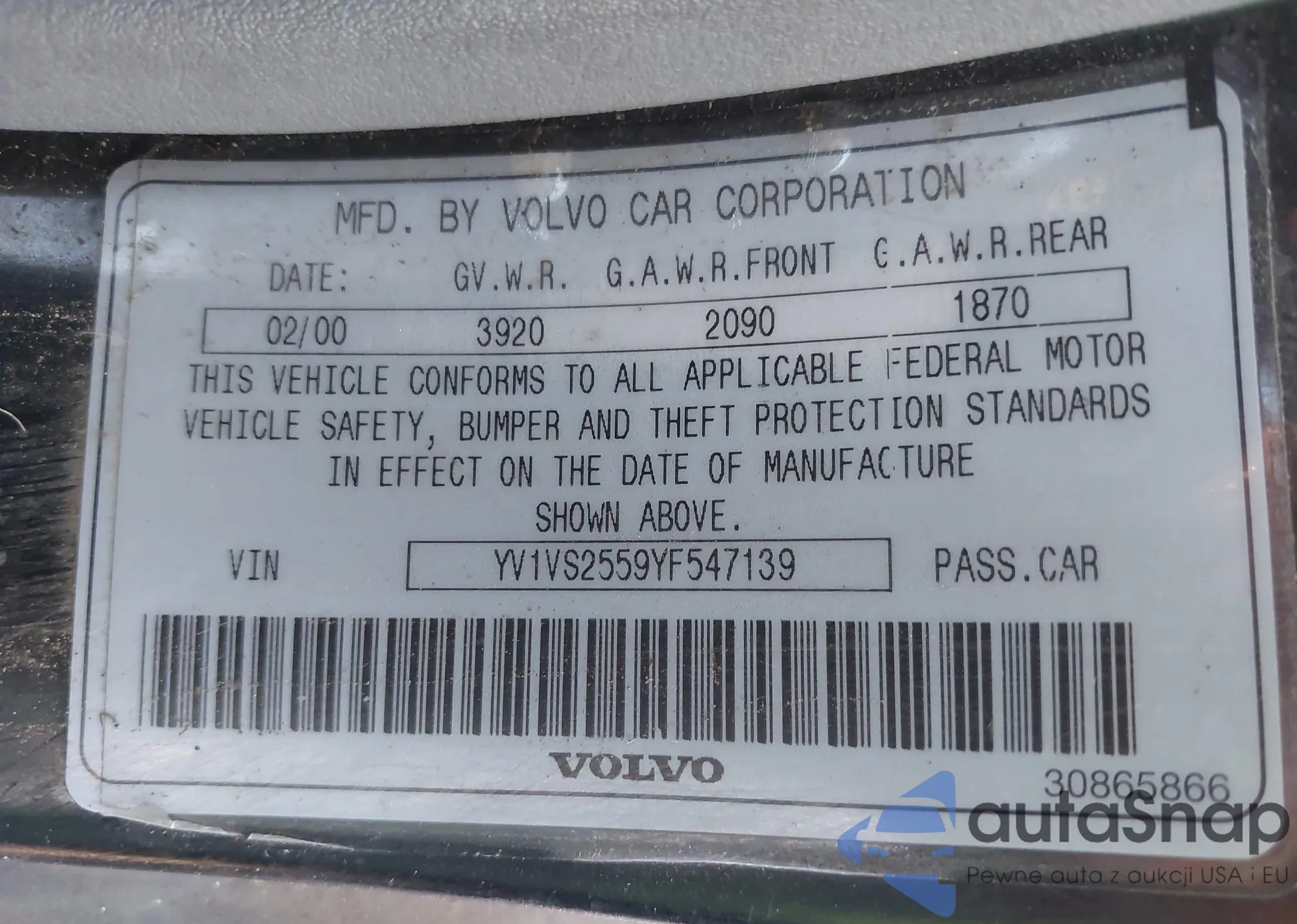 VIN: YV1VS2559YF547139